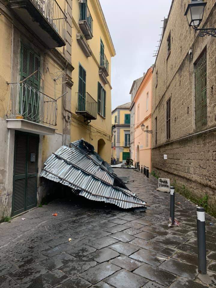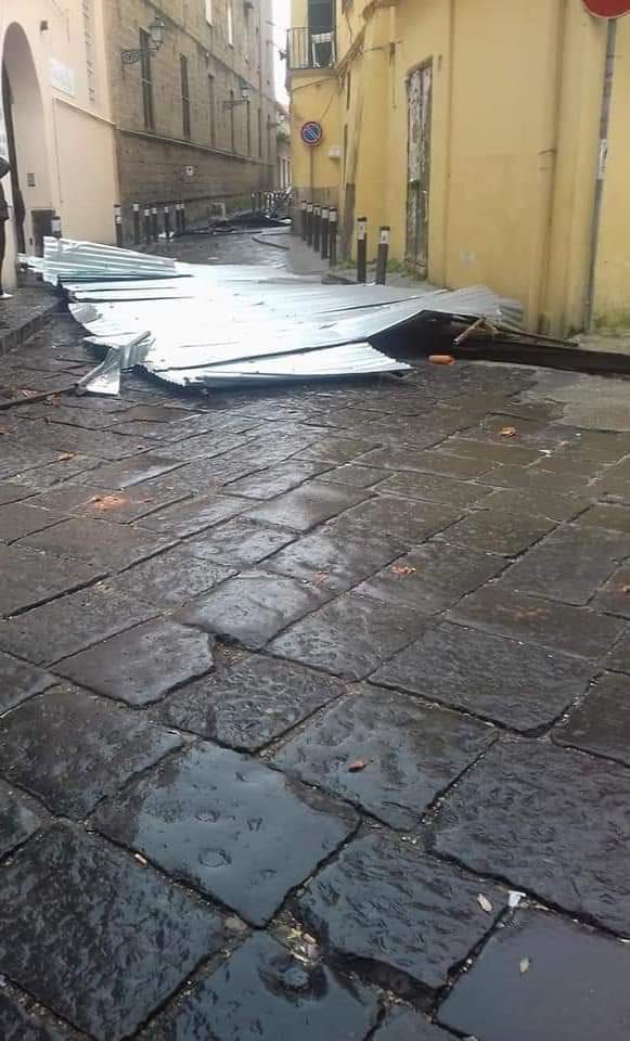 In via San Nicola, centro storico di Aversa a due passi dal mercato, sono volate in strada due lamiere. Solo per miracolo in quel momento nessuno stava transitando nella zona.