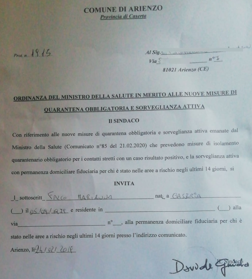 La replica del sindaco di Arienzo Davide Guida: “In merito alla situazione della signora Marianna Falco mi preme segnalare che il sottoscritto non ha firmato nessuna ordinanza per quarantena da COVID-19, mai avrei potuto farlo. È stato notificato alla signora un semplice invito previsto da un’ordinanza del Ministero della Salute. Un mero atto precauzionale nell’interesse della signora e, soprattutto, della comunità che mi onoro di rappresentare.”