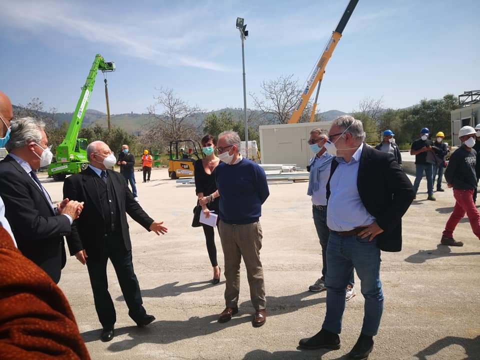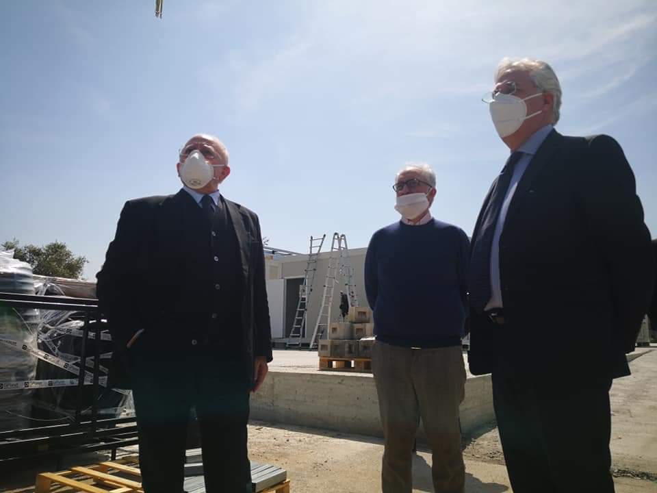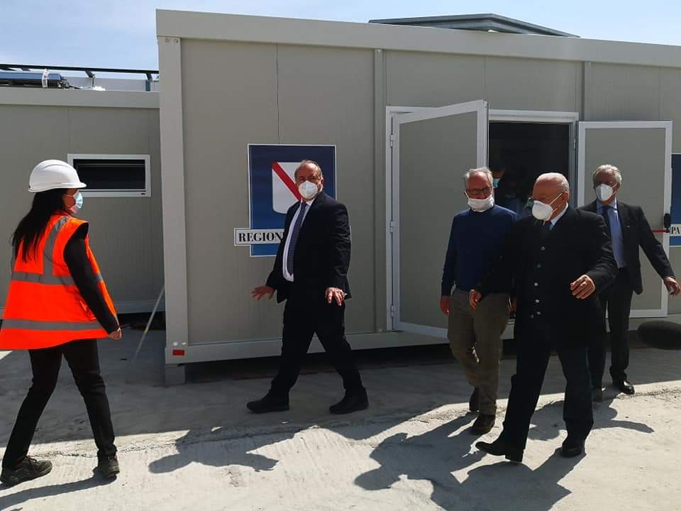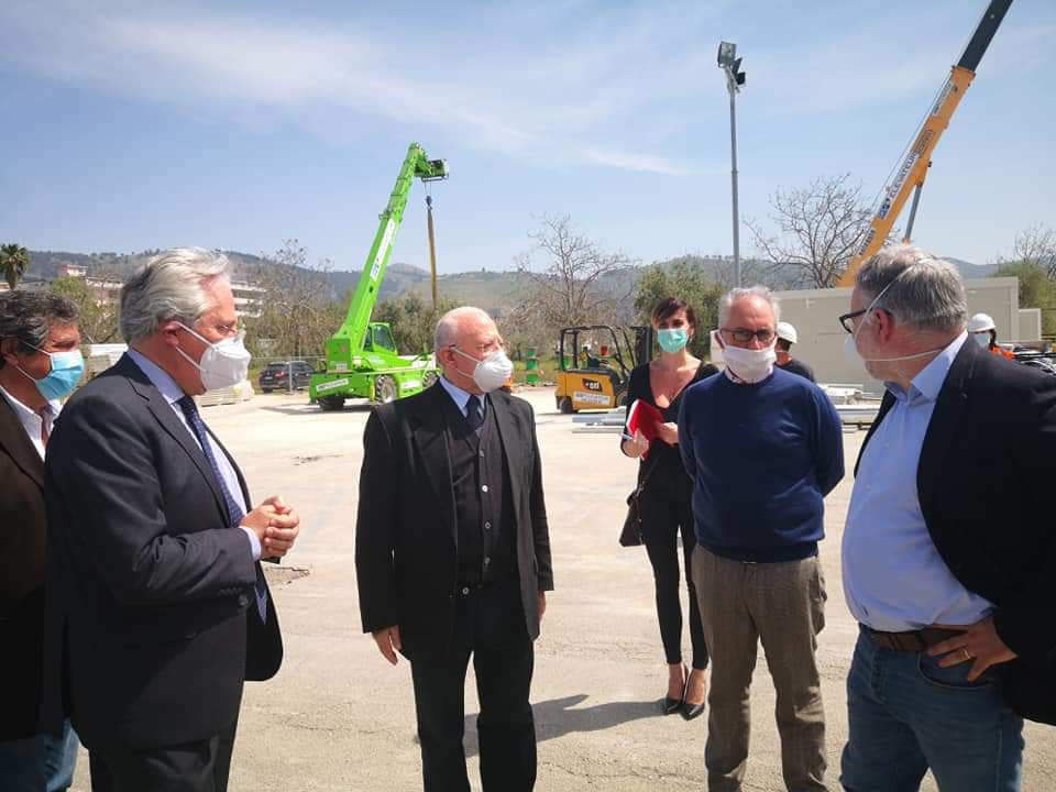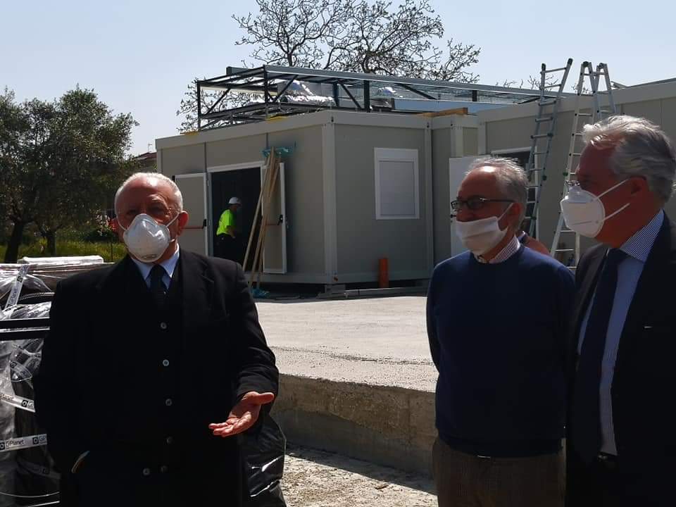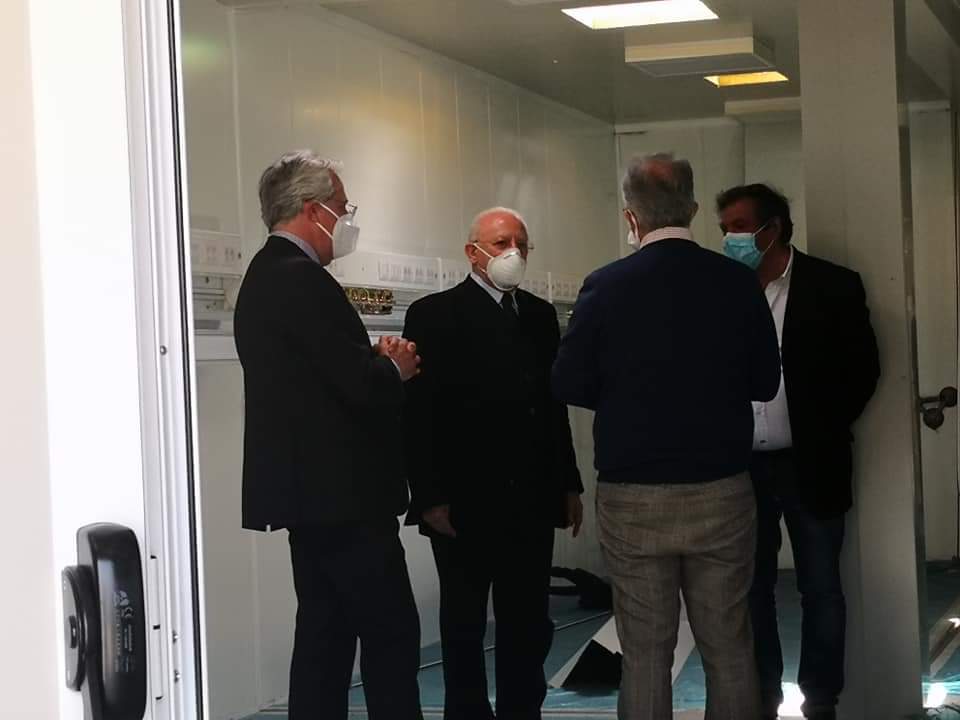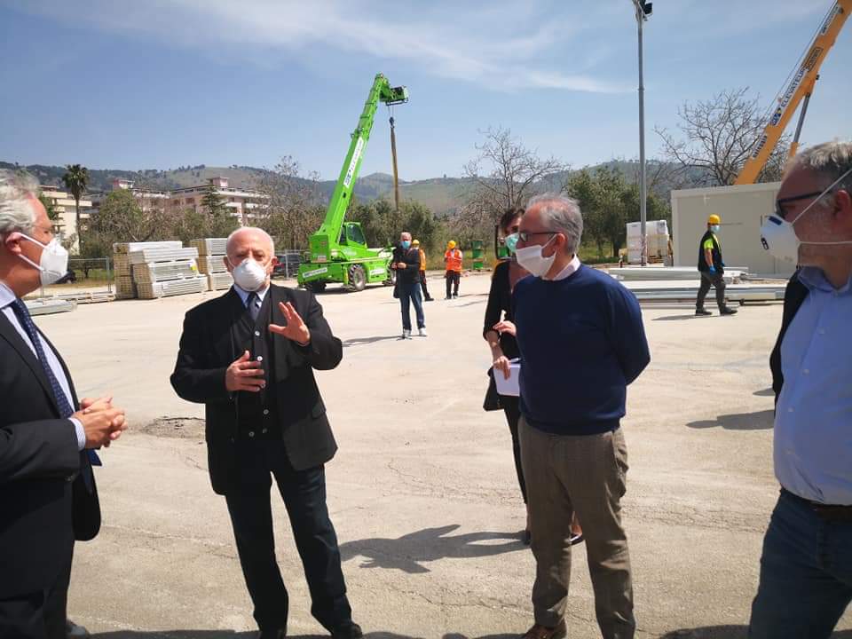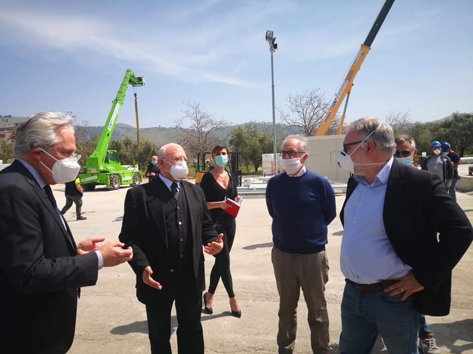 Caserta. Visita del governatore della Campania, stamattina, all’ospedale modulare Covid in corso di realizzazione a Caserta. Un “intervento dal valore straordinario”, lo ha definito De Luca, che prevede la realizzazione di 24 posti letto di terapia intensiva, grazie al quale si “avra’ la possibilita’ di separare nettamente l’attivita’ ospedaliera normale dall’attivita’ dedicata ai pazienti Covid”.