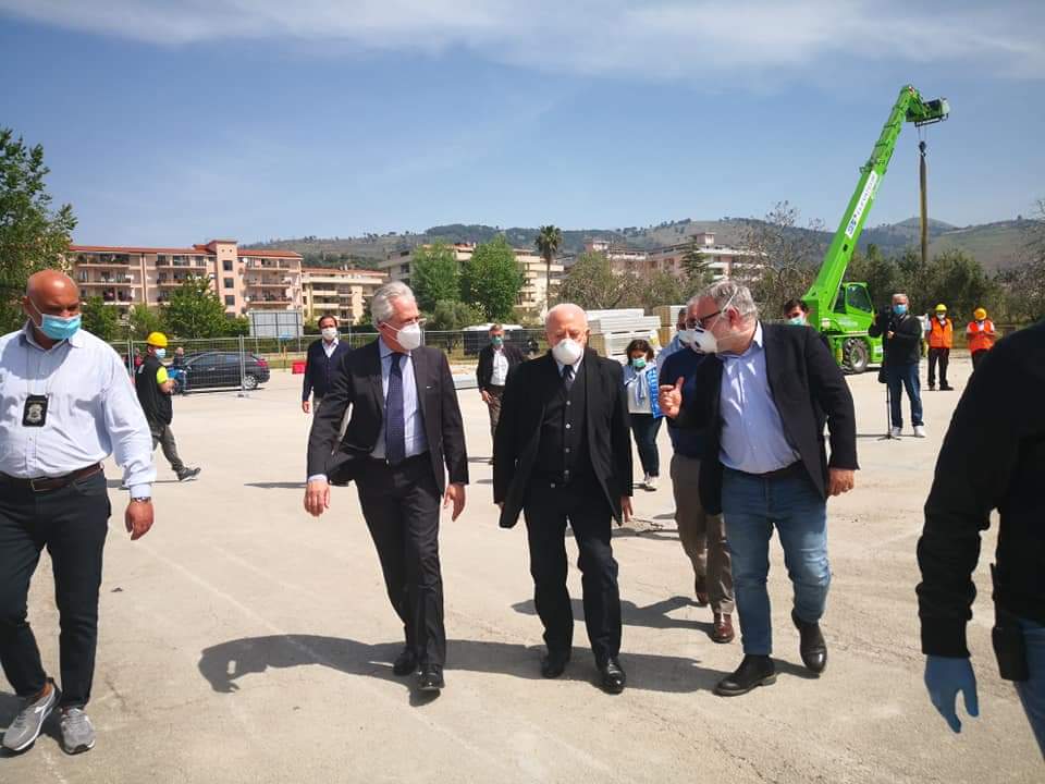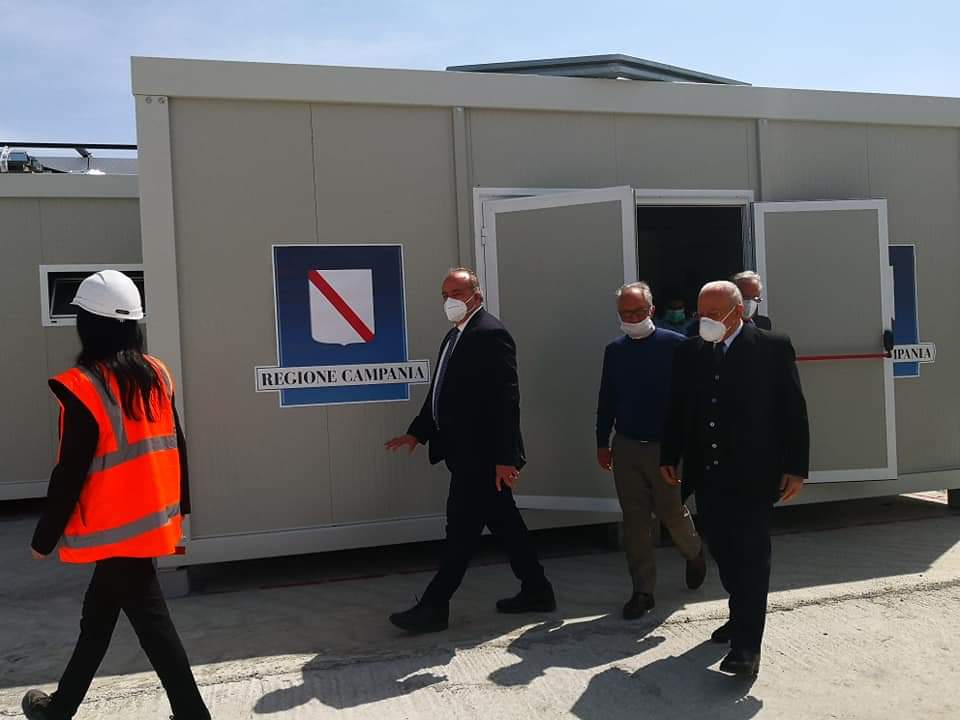 Caserta. Visita del governatore della Campania, stamattina, all’ospedale modulare Covid in corso di realizzazione a Caserta. Un “intervento dal valore straordinario”, lo ha definito De Luca, che prevede la realizzazione di 24 posti letto di terapia intensiva, grazie al quale si “avra’ la possibilita’ di separare nettamente l’attivita’ ospedaliera normale dall’attivita’ dedicata ai pazienti Covid”.