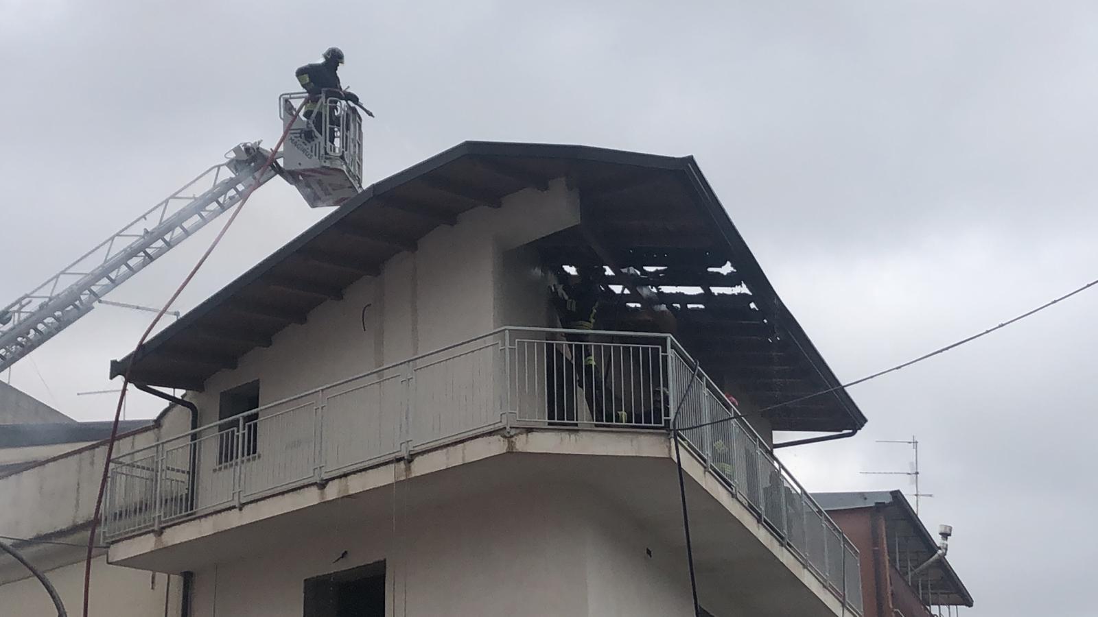 AGGIORNAMENTO. E’ andata in fiamme la copertura in legno di questa mansarda, i pompieri sono saliti con una gru e hanno domato il rogo. Tre i mezzi giunti sul posto dal comando provinciale. La strada è stata chiusa al traffico.