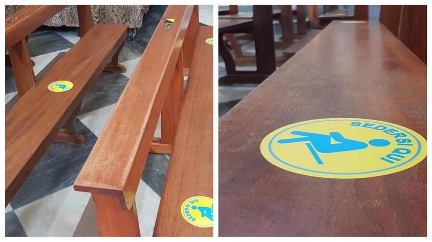 Santa Maria a Vico. “Per continuare a familiarizzare con quelle realtà che caratterizzeranno il nostro entrare e il nostro stare in Chiesa in questa seconda fare della pandemia, abbiamo evidenziato ancora meglio, con adesivi, i posti, 180, che si possono occupare, rispettando la distanza laterale e frontale di un metro.”