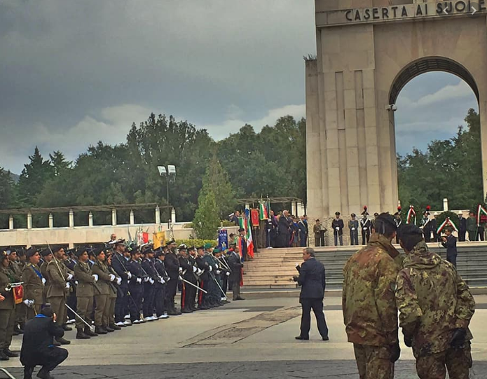 schieramento sul piazzale del Monumento ai Caduti: a) dei Gonfaloni decorati di Medaglia d’oro al Valor Militare (Comuni di Bellona e Mignano Monte Lungo) e di quelli del Comune di Caserta e della Provincia di Caserta; b) di n. 3 Labari in rappresentanza delle Associazioni Combattentistiche e d’Arma. Arrivo del Prefetto di Caserta. cerimonia dell’Alzabandiera. deposizione di n. 2 (due) corone di alloro da parte del Prefetto di Caserta, del Sindaco di Caserta, del Presidente della Provincia e del Comandante della Divisione “Acqui” di Capua. lettura da parte del Prefetto del messaggio del Signor Presidente della Repubblica.