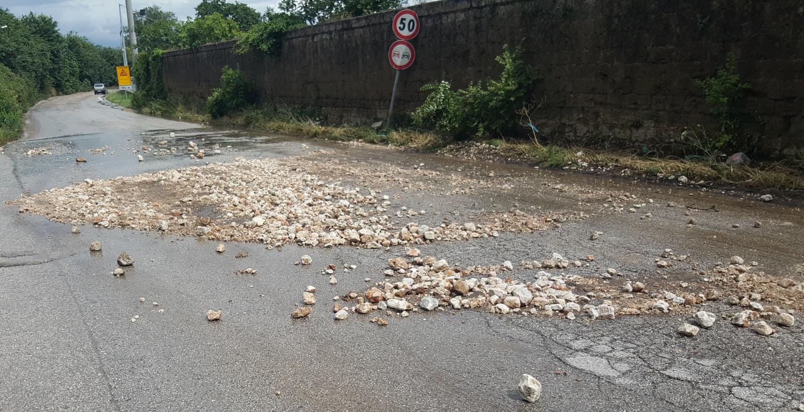 Sono stati chiamati anche i vigili urbani. Le pietre sono cadute dalla montagna (FOTO GALLERY). Davvero danni importanti per l’intero territorio, anche nel centro della frazione a sud del territorio.