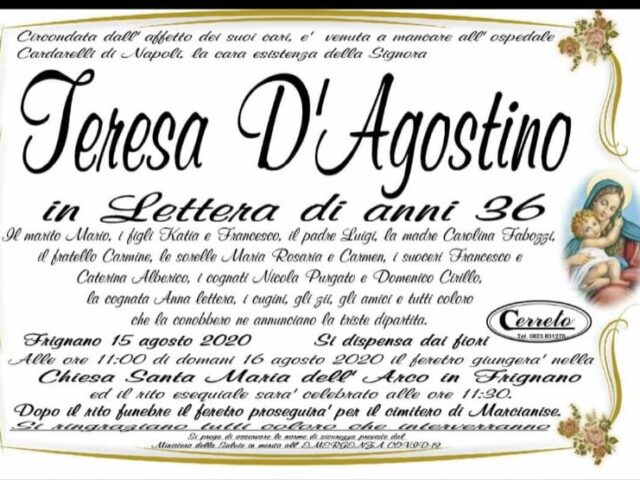 Marcianise/Frignano. Si terranno in mattinata a Frignano i funerali della 36enne Teresa D’Agostino di 36 anni, deceduta il 14 pomeriggio al Cardarelli di Napoli dove combatteva contro un brutto male. Fino all’ultimo si è sperato che potesse superarlo.