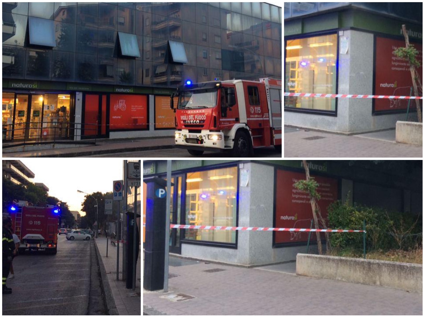 Caserta. Vigili del fuoco in azione a Caserta nella commerciale via GM Bosco. E’ stato fatto evacuare il market Natura Sì  per via del fumo che proveniva da un locale sottostante, dove è andato in tilt l’antifurto nebbiogeno, precisamente si tratta di una scuola di ballo.