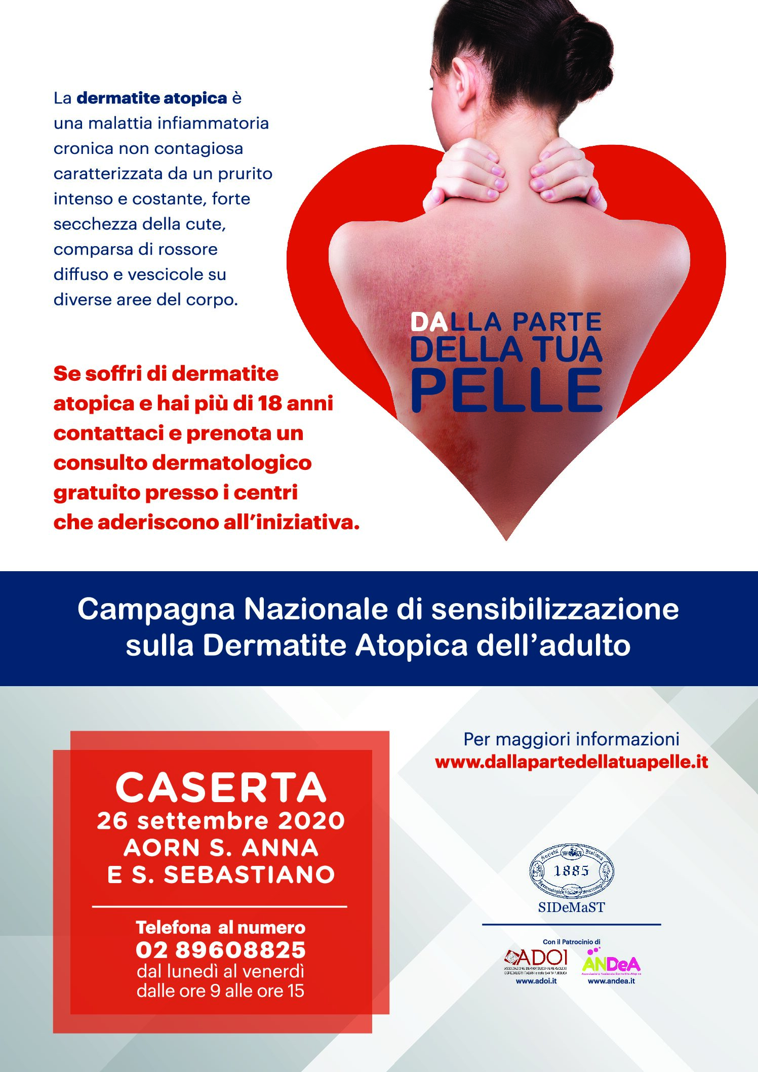 Sabato 26 settembre, presso l’Unità Operativa di Dermatologica dell’AORN Sant’Anna e San Sebastiano di Caserta diretta dal Dott. Battarra chi soffre di dermatite atopica potrà prenotare una visita di controllo dermatologico gratuito telefonando al numero 02 89608825 dal lunedì al venerdì dalle ore 9,00 alle ore 15,00.
