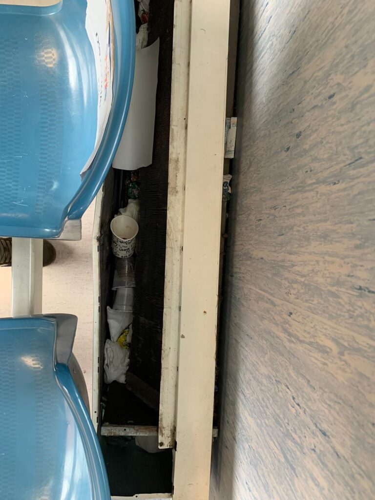 Come hanno raccontato alcuni pazienti in attesa, infatti, la pioggia si sarebbe infiltrata anche nell’edificio D, nella sala d’attesa di riabilitazione e cardiologia. I pazienti hanno anche notato accumuli di rifiuti sui termosifoni, tra bicchieri di plastica e cartacce, ci sarebbe la necessità di effettuare un intervento di pulizia più approfondita.