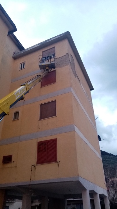 San Felice a Cancello. Paura a Piedarienzo, in corso Abatemarco, presso la zona delle case popolari. A causa delle forti raffiche di vento si è staccata una consistente parte di intonaco di un palazzo (FOTO).