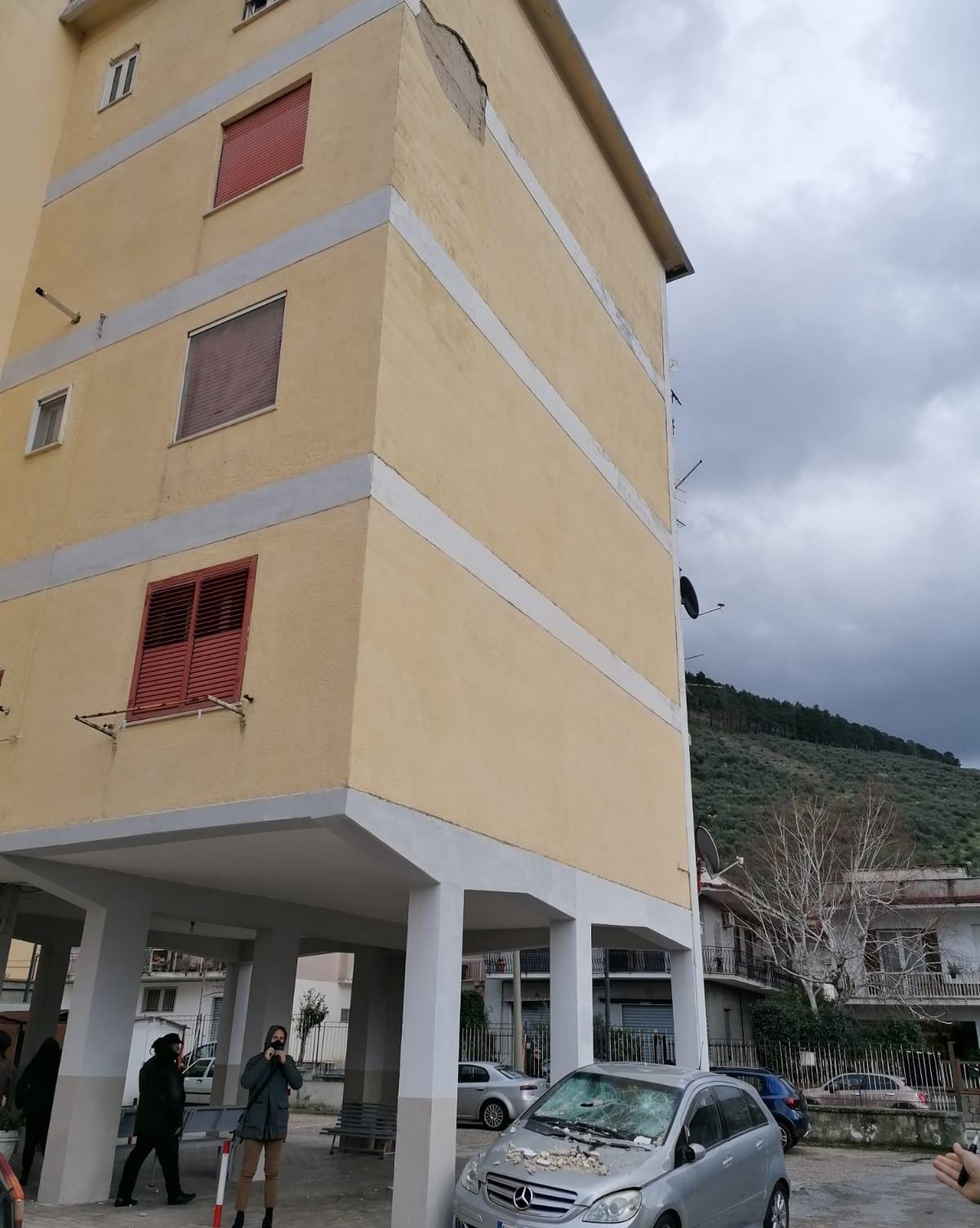 I calcinacci sono crollati sulla vettura di un congiunto dell’estinto, una Mercedes grigia, danneggiandola in maniera seria, sul posto è dovuto giungere un carro attrezzi per portarla via.