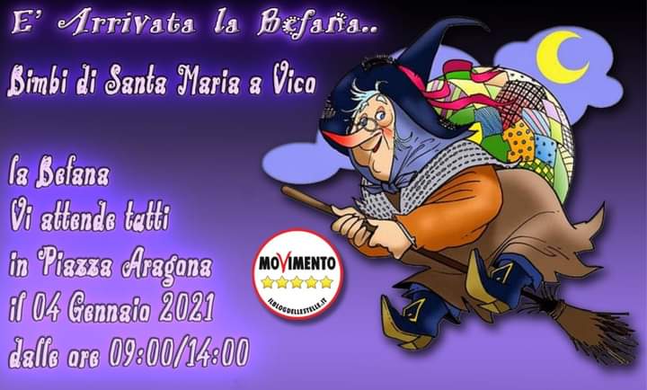 Santa Maria a Vico. Gli attivisti del Movimento 5 Stelle di Santa Maria a Vico invitano i bimbi a recarsi in Piazza Aragona dalle ore 9:00/14:00 per ritirare un piccolo dono o la calza della Befana.