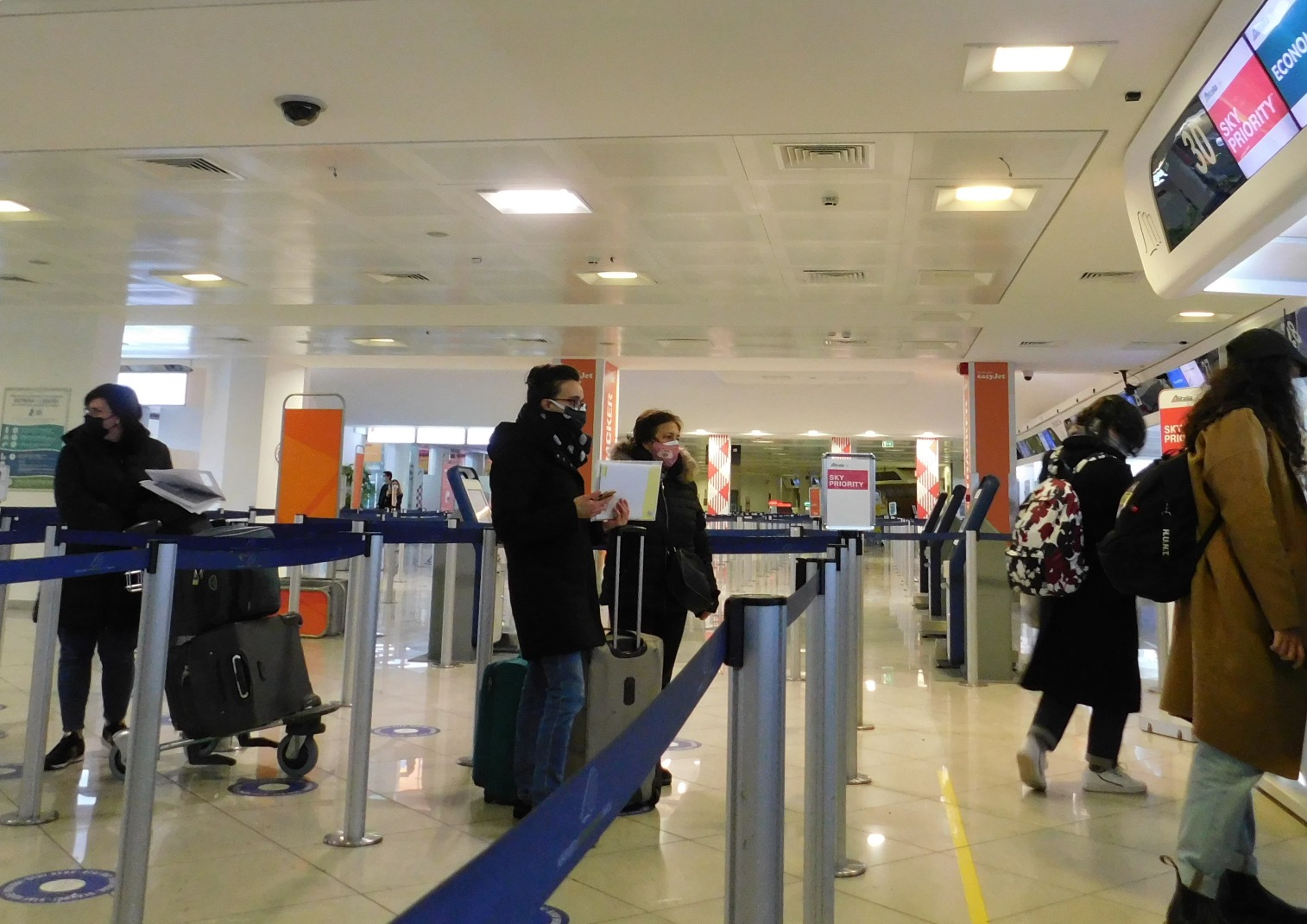 “Apriti cielo!” avranno pensato, sperato e detto le viaggiatrici in possesso dell’attestato scritto solo in italiano e immediatamente incollatesi agli smart alla disperata ricerca di contatti utili e soluzioni efficaci. Irremovibile, intanto, il personale addetto agli sportelli, sicché le viaggiatrici col diavolo nei capelli stazionavano, rapite dall’ansia, ai lati del corridoio delimitato a zig-zag dalle cinghie. L’idea di dover rinviare la partenza le atterriva. Contattàti i Centri, per lo più privati, che avevano rilasciato il documento, le risposte tardavano ad arrivare, sia per l’orario non proprio d’ufficio, sia per l’oggettiva difficoltà di reperire presto gli stampati e i traduttori che avrebbero dovuto burocraticamente regolarizzare. Malgrado la pioggerellina che, in quei frangenti, cadeva su Napoli, ad un certo punto, mentre il tempo scorreva lesto più del solito, si è affacciato un raggio di sole, grazie all’arrivo di un funzionario dell’Alitalia che ha rifatto il tentativo, già esperito dai suoi colleghi che avevano contattato telefonicamente la sede centrale dell’Alitalia ma con esito negativo che aveva vieppiù destato la preoccupazione delle donne pronte ad imbarcarsi e tutte, per fortuna, non aggredite dal coronavirus.