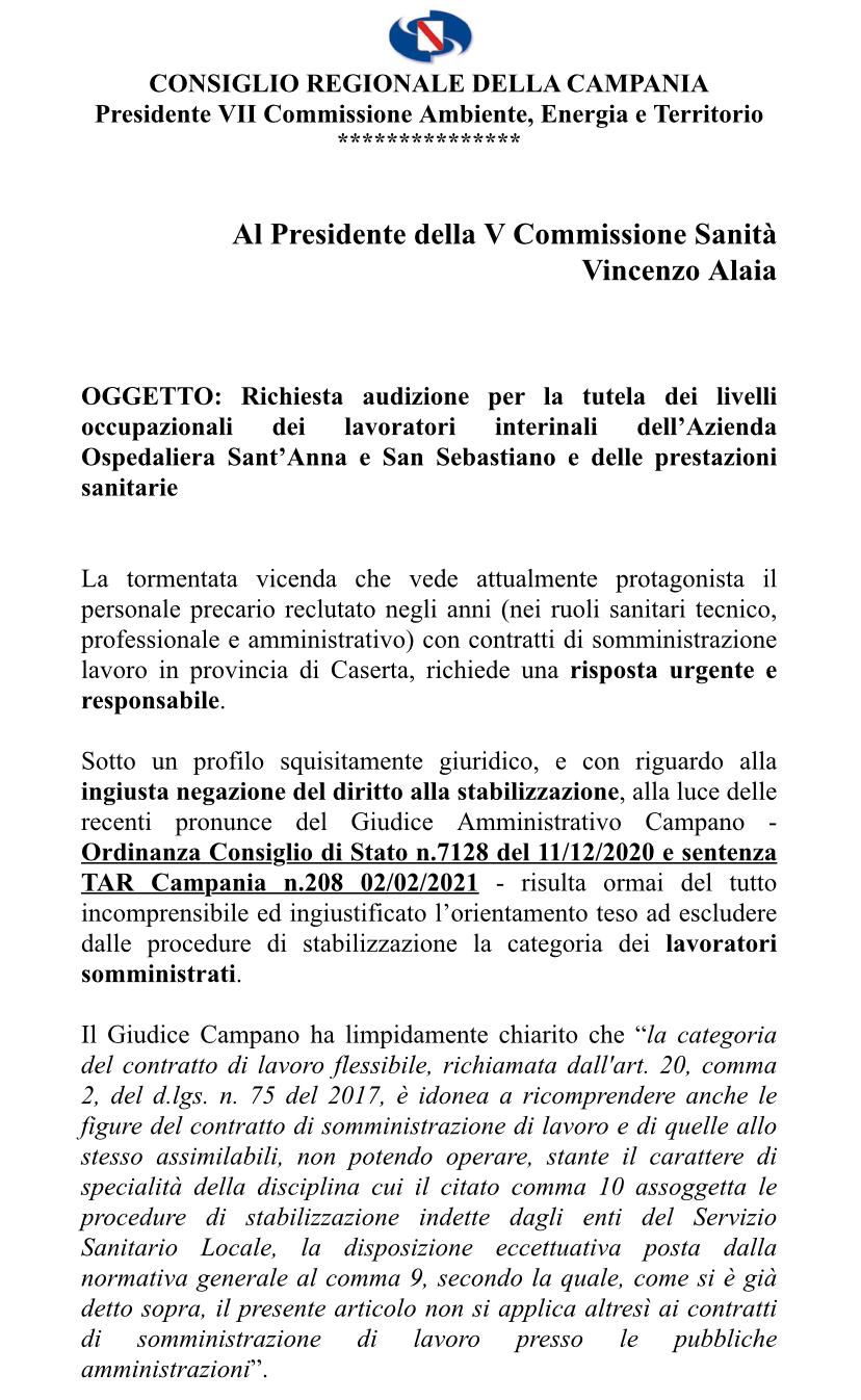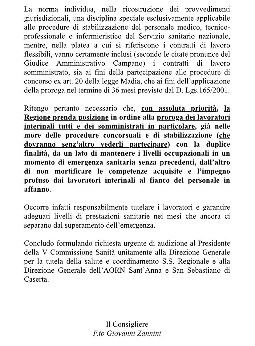 L’intervento della regione – spiega Zannini – è doveroso alla luce delle recenti pronunce del tar napoli che ha definitivamente chiarito come anche questa categoria di somministrati (oss e infermieri nello specifico ) debba ritenersi pacificamente inclusa all’interno del bacino dei somministrati da stabilizzare. Ecco qui di seguito il testo della richiesta di Zannini: