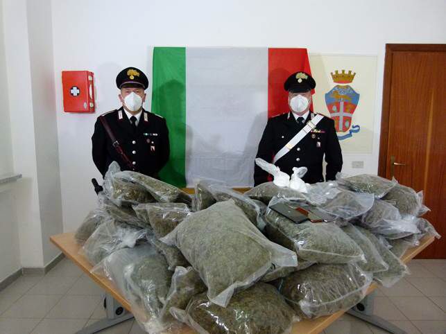 L’intervento dei carabinieri ha interrotto le operazioni medianti le quali i due stavano tentando di occultare, ricoprendoli con il terreno, 3 bidoni in materiale plastico a tenuta stagna, al cui interno erano stivate 61 confezioni di cellophane termosaldate contenenti chilogrammi 33,00 di infiorescenze essiccate di marijuana e grammi 480 di cocaina.