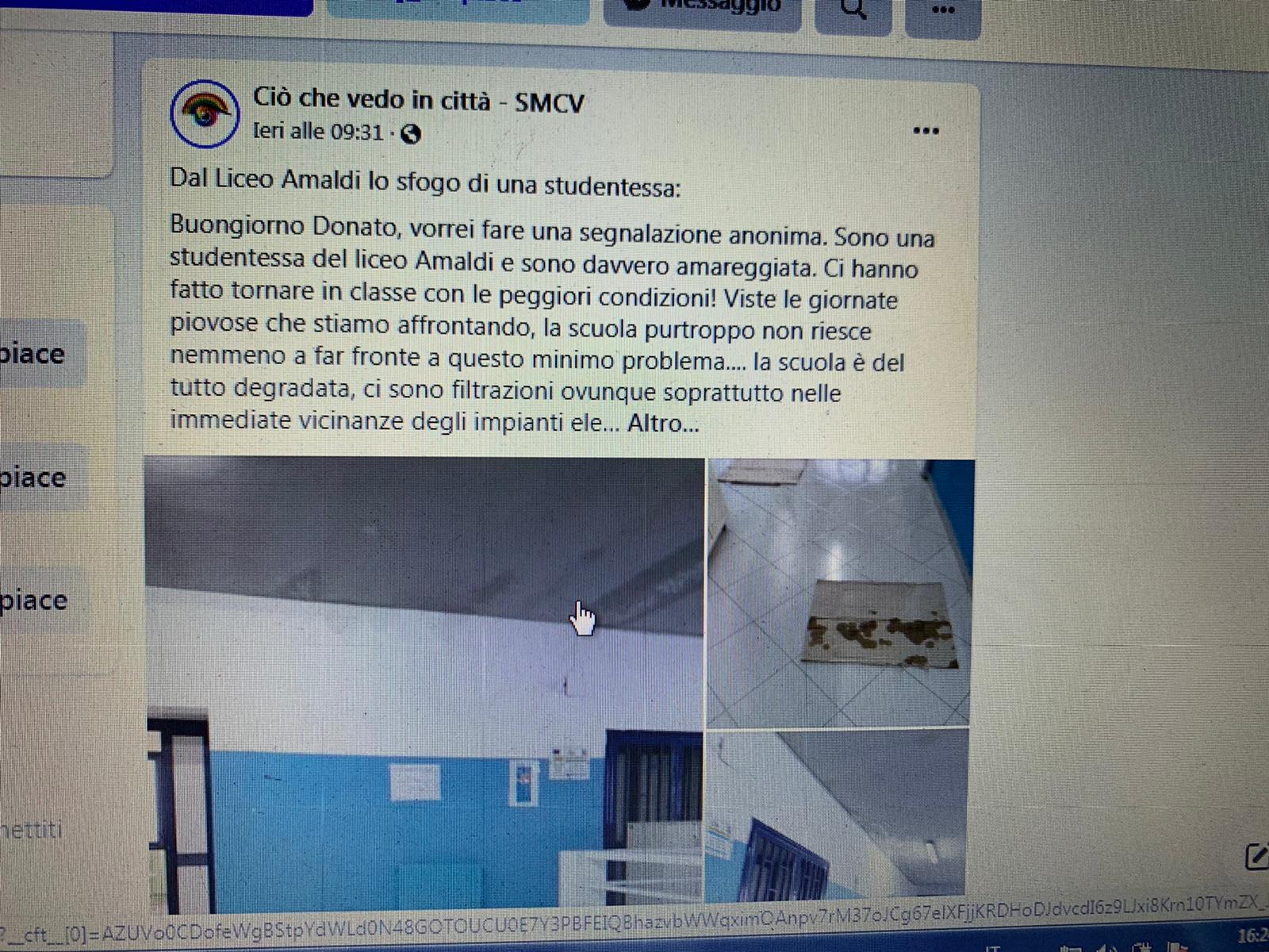 SANTA MARIA CAPUA VETERE. Le Associazioni sammaritane “Futuro 2030”, “Passione civica”, “No STIR”, “Svoltiamo”, “Movimento civico sammaritano” e l’associazione politico-culturale “S.U.D. per l’Italia” denunciano lo stato di abbandono in cui versano alcuni istituti scolastici della città. È di qualche giorno fa la segnalazione di una studentessa del Liceo Amaldi la quale denunciava lo stato di degrado in cui versa la scuola, a partire dalle infiltrazioni d’acqua del soffitto di uno dei piani della scuola. Dopo i notevoli ritardi nella riapertura delle scuole, gli studenti sammaritani devono far fronte anche a questo tipo di problematiche.
