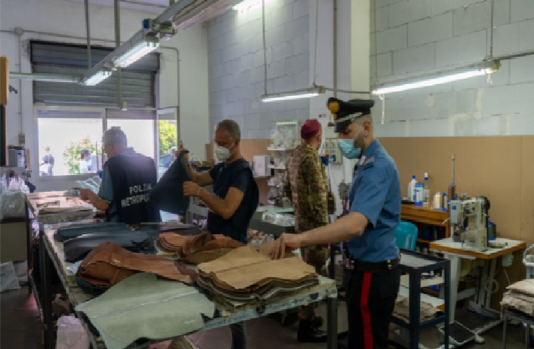 Il 10 Giugno sono entrati in azione 25 equipaggi per un totale di 58 unità interforze, nelle località e nei siti in cui abitualmente vengono abbandonati e quindi conferiti in modo illecito i rifiuti sul territorio, controllando 7 attività imprenditoriali e commerciali, di cui 3 sequestrate, 61 persone identificate, di cui 12 denunciate tra lavoratori irregolari rei di illeciti ambientali e 5 sanzionate, 37 veicoli controllati, circa 550 mq di aree sequestrate, circa 12.333,00 euro di sanzioni comminate. Fra le attività sequestrate una pelletteria sita nello scantinato di un edificio, dove venivano fabbricare borse e scarpe completamente al nero. Al nero anche i quattro lavoratori trovati in servizio. L’attività è stata denunciata, fra l’altro, per scarichi e versamento illeciti.