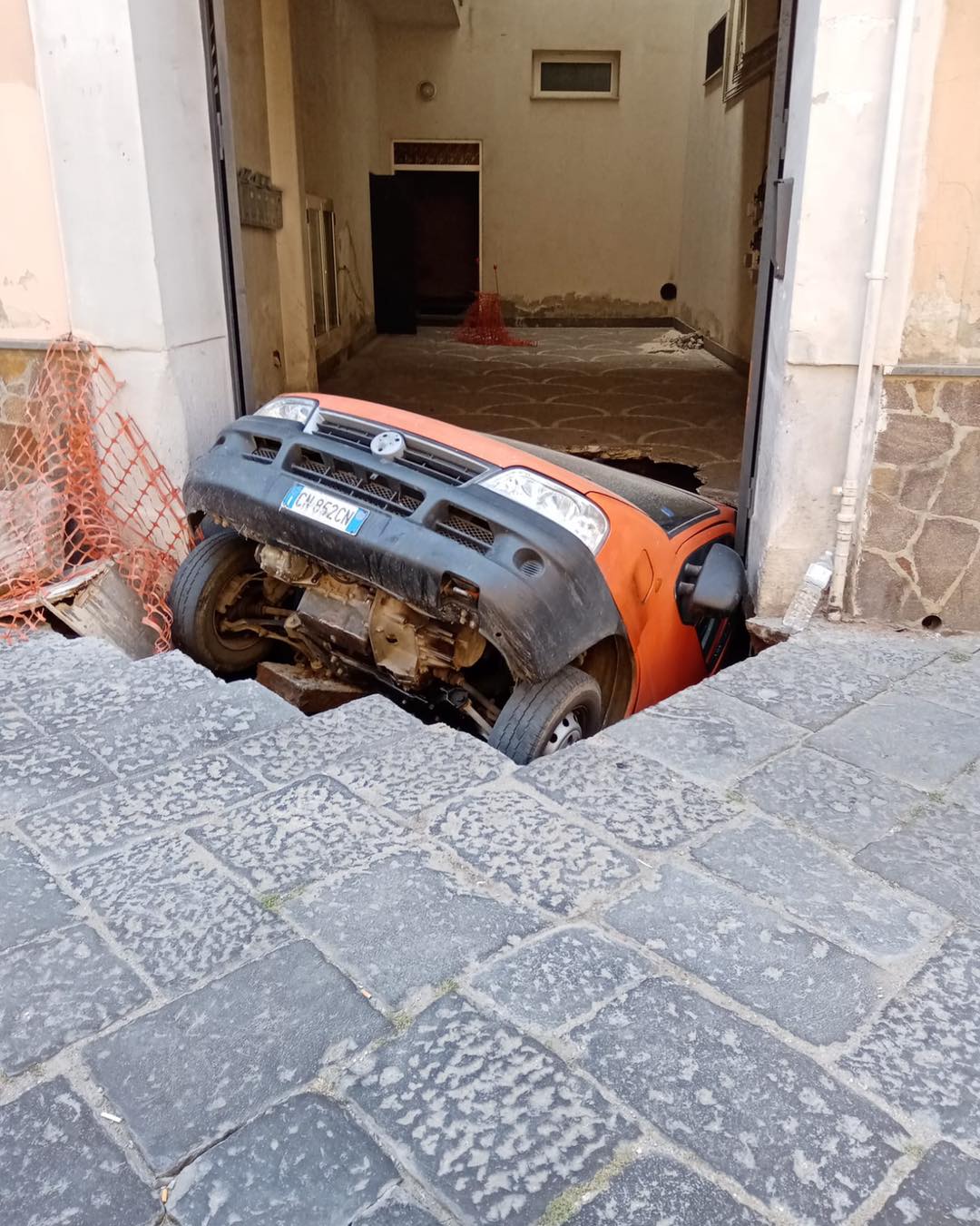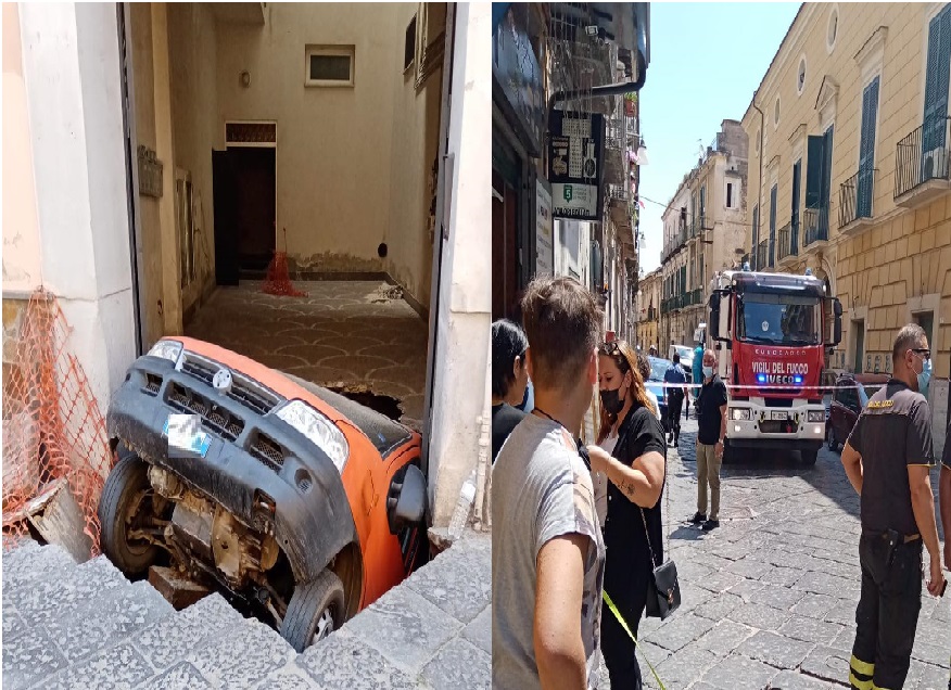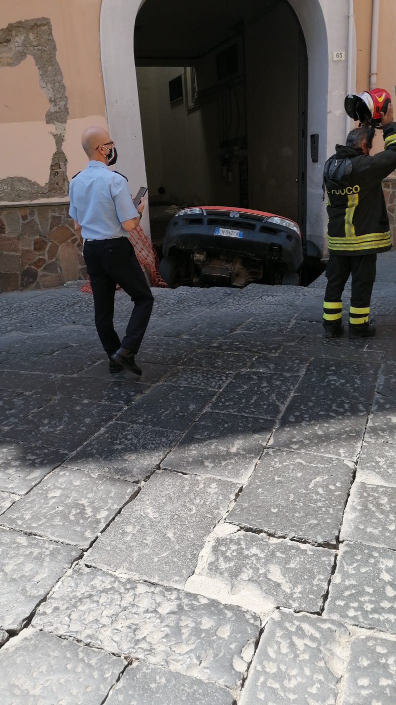 E’ accaduto nei presi di un cortile di via Roma dove sono in corso lavori: si è aperto uno squarcio sul manto stradale che ha risucchiato la parte posteriore del veicolo come emerge dalle foto pubblicate dalla pagina Ciò che vedo in città.