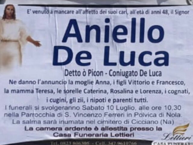 Polvica di Nola. Si svolgeranno domani, sabato 10 luglio, alle ore 10:30 nella parrocchia di San Vincenzo Ferreri in Polvica di Nola, i funerali di Aniello De Luca, il centauro 48enne morto a seguito di un incidente stradale avvenuto il 4 luglio scorso.