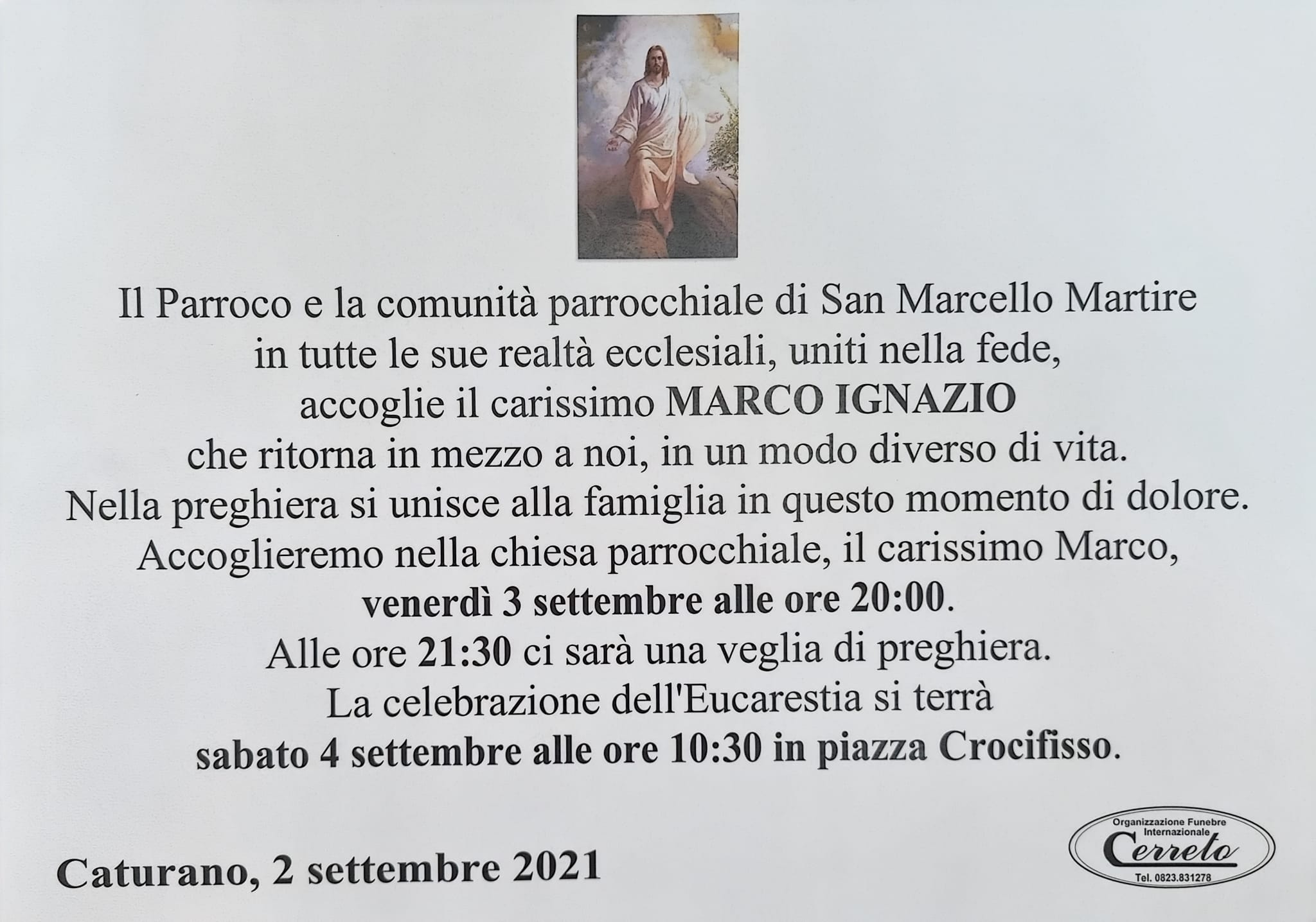 Il corpo del povero Marco giungerà dalla città di Reggio Calabria alle 20 di domani presso la parrocchia di San Marcello Martire a Caturano dove verrà allestita la camera ardente. Le esequie si svolgeranno sabato alle 10.30 in piazza Crocefisso.