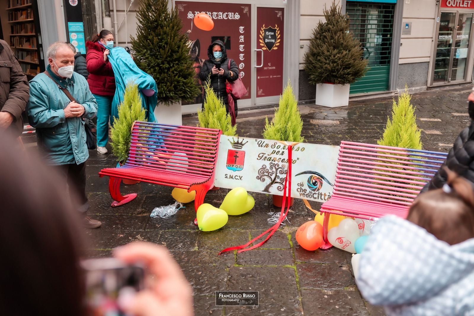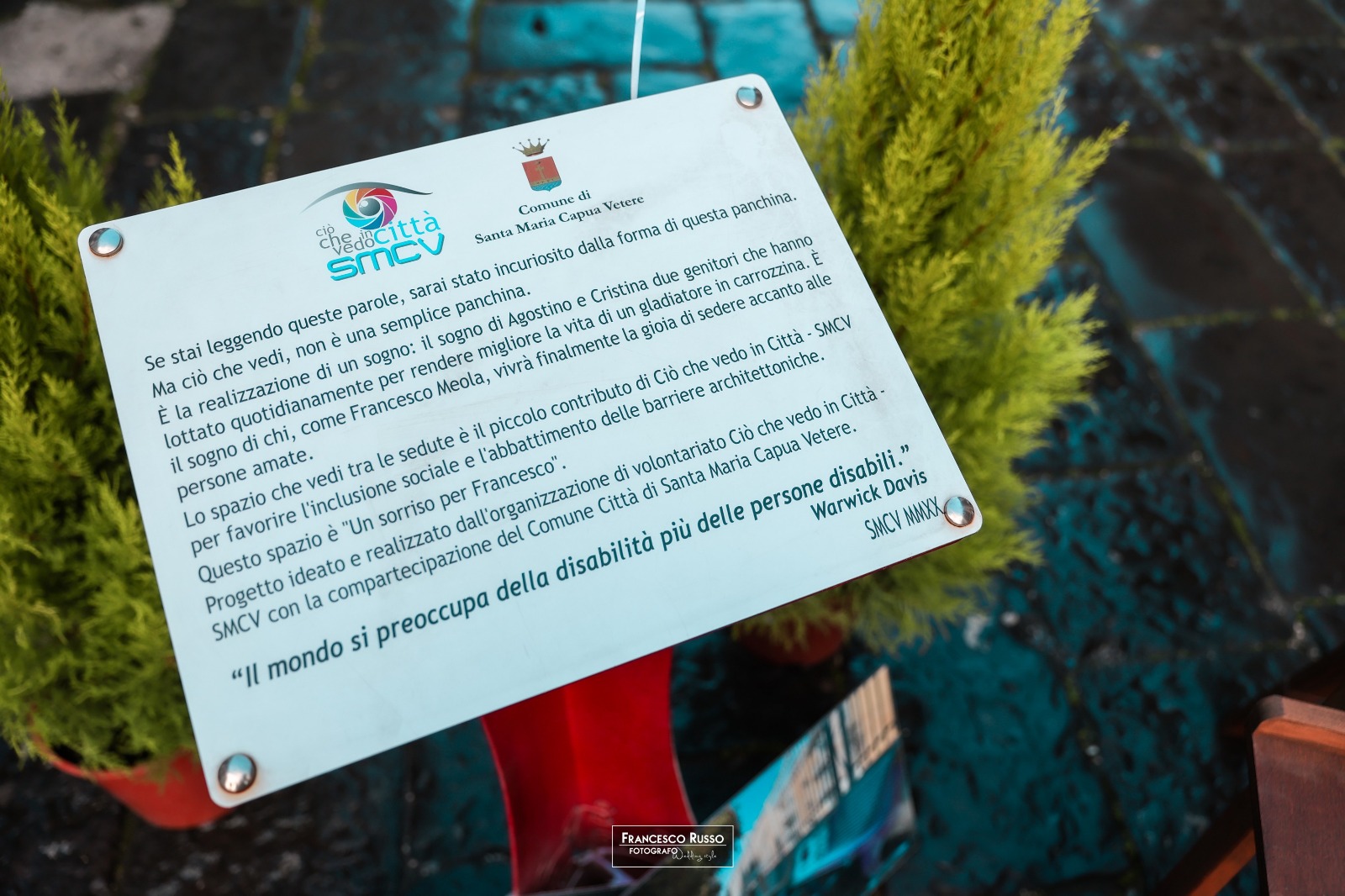 L’Associazione – in compartecipazione con il comune di Santa Maria Capua Vetere – ha infatti donato alla propria città ben cinque panchine inclusive, tutte realizzate artigianalmente e sapientemente decorate dall’artista Claudio Petito. Il progetto “Un sorriso per Francesco” in ricordo del piccolo Francesco Meola, ha così consentito all’intera comunità di compiere un piccolo ed ulteriore passettino in avanti nella lotta all’abbattimento delle barriere architettoniche.
