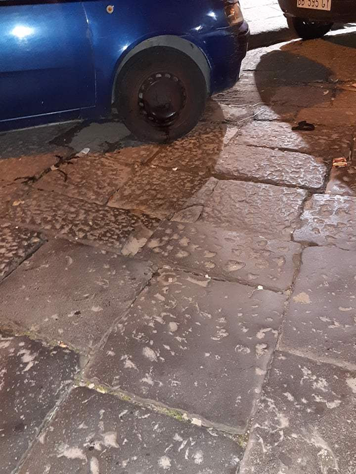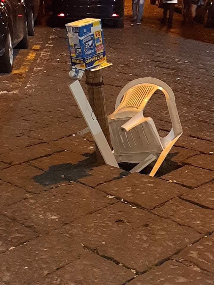 Intanto a Napoli città la situazione continua a peggiorare. Nel quartiere San Lorenzo, una buca, creata dal basolato divelto, è stata ‘segnalata’ con una sedia.