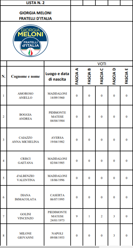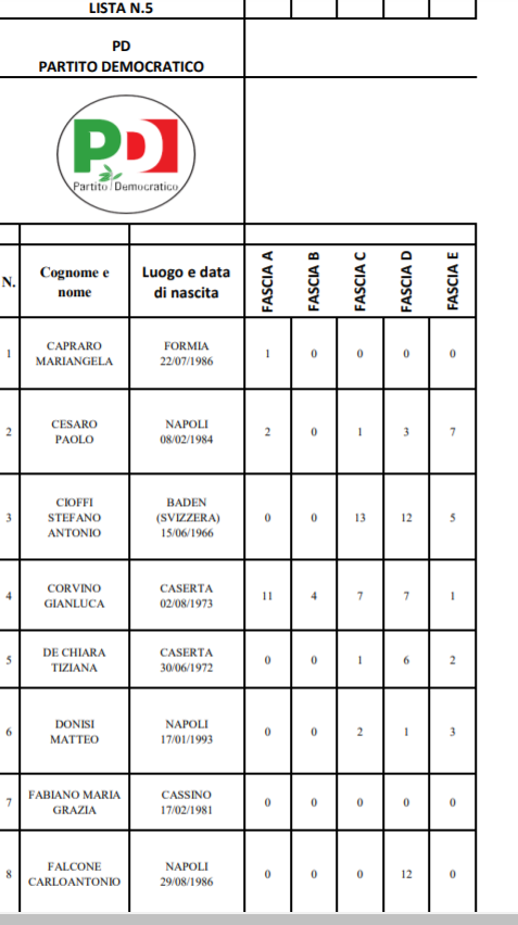 Caserta. Alleghiamo nella nostra gallery tutte le preferenze dei candidati alla Provincia di oggi, senza il conteggio del voto ponderato totale ma per fasce, dalla più piccola A alla più grande E.