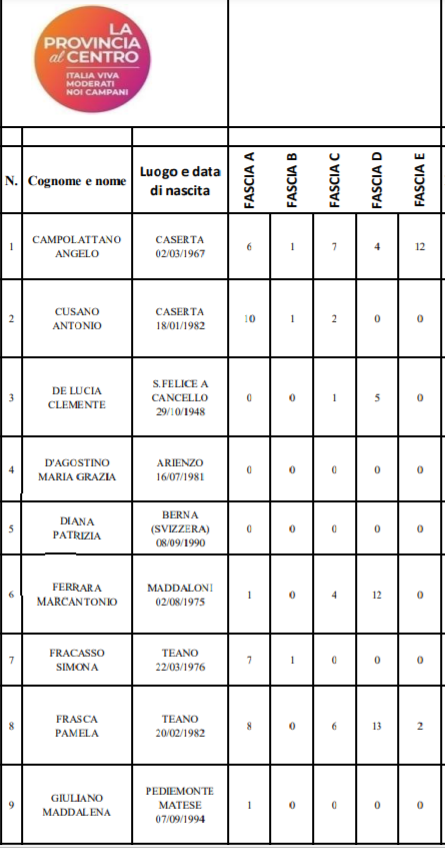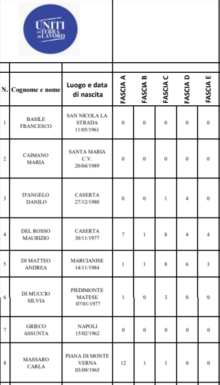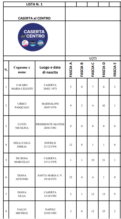 Caserta. Alleghiamo nella nostra gallery tutte le preferenze dei candidati alla Provincia di oggi, senza il conteggio del voto ponderato totale ma per fasce, dalla più piccola A alla più grande E.
