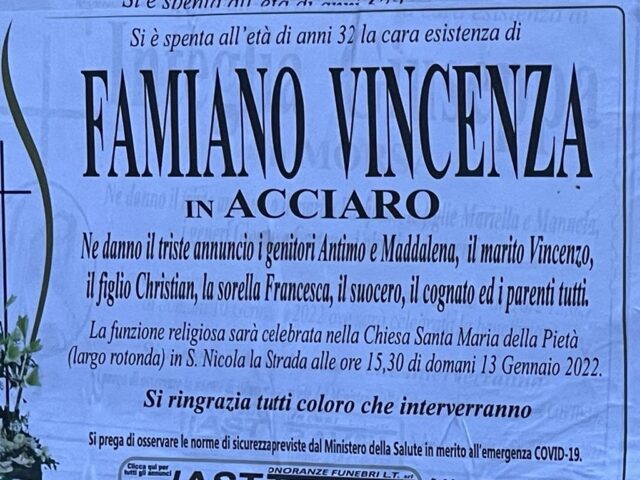 SAN MARCO EVANGELISTA/SAN NICOLA LA STRADA. Saranno celebrati oggi alle 15,30 alla chiesa di Santa Maria della Pietà al largo rotonda a San Nicola i funerali di Vincenza Famiano, la giovane mamma morta a 32 anni per un infarto nell’abitazione di San Marco Evangelista. Il marito Enzo e il figlio Christian di appena un mese.