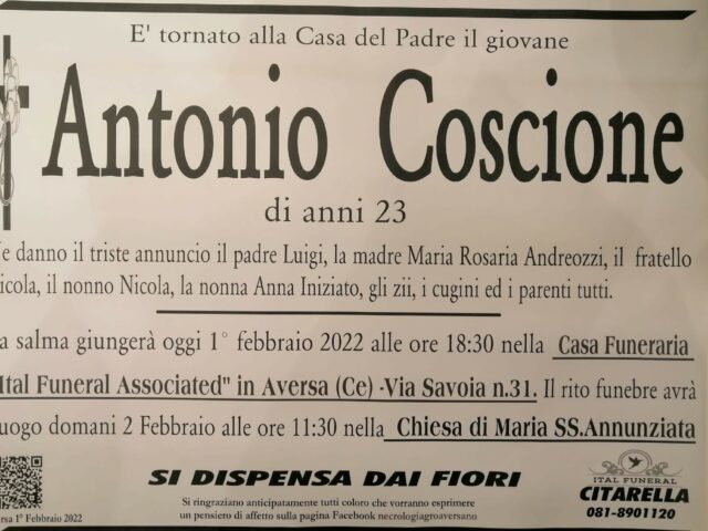 AVERSA. Saranno celebrati oggi alle 11,30 nella chiesa dell’Annunziata i funerali di Antonio Coscione, il 23enne deceduto dopo un terribile incidente.
