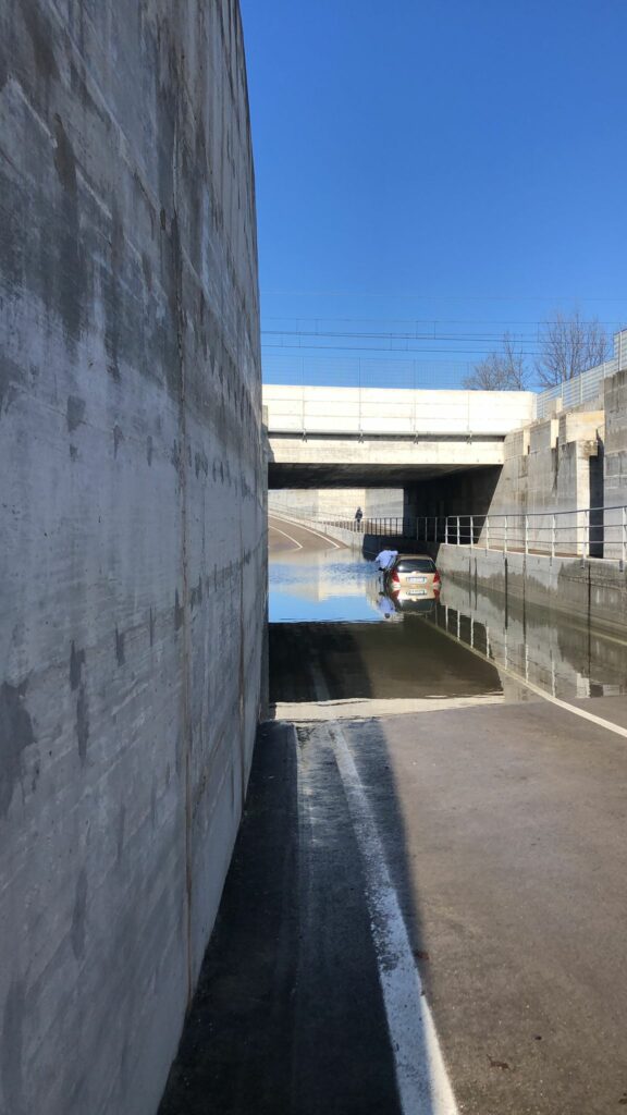 Non a caso questa mattina un automobilista è rimasto intrappolato nel sottopasso trasformatosi in una mega piscina dopo la pioggia (nemmeno troppo violenta a dire il vero di ieri). Il conducente probabilmente non pensava di dover ancora guardarsi dall’acqua alta con la nuova opera e la giornata di sole. E invece appena percorso il tratto si è ritrovato in un metro d’acqua, arrivata ben oltre la portiera al punto che si è dovuto affacciare dal finestrino in attesa dei soccorsi.