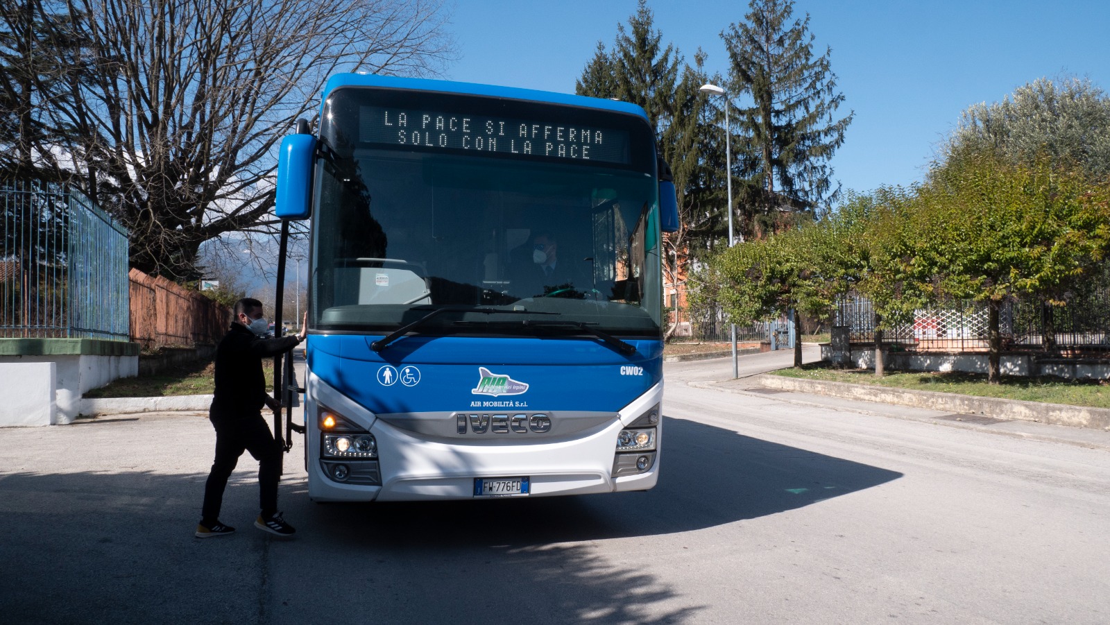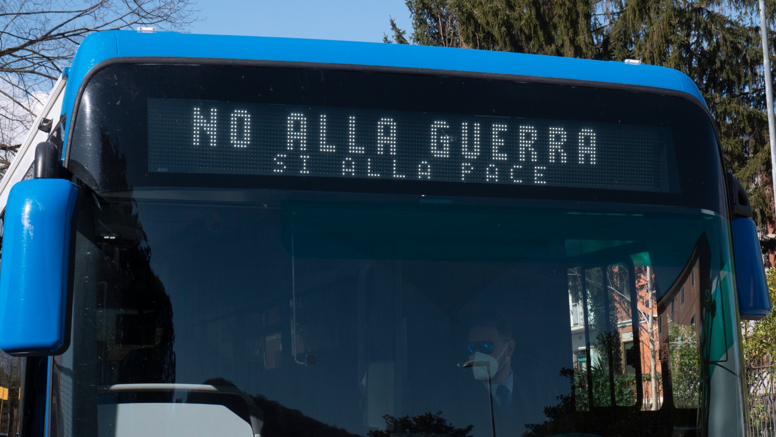 Sui pullman, a rotazione, compariranno le scritte: «La pace si afferma solo con la pace», frase pronunciata da Paolo VI nel 1976 in occasione della IX giornata mondiale della pace e rilanciata da Papa Francesco nell’omelia del 2013 ai tempi del conflitto in Siria; una incitazione alla pace contro la guerra; una esortazione in dialetto per accentuare il potenziale espressivo della frase e sostenere le ragioni dello stop alla guerra.