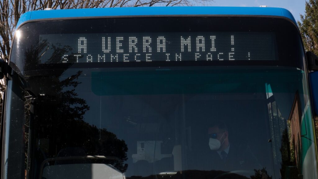 Sui pullman, a rotazione, compariranno le scritte: «La pace si afferma solo con la pace», frase pronunciata da Paolo VI nel 1976 in occasione della IX giornata mondiale della pace e rilanciata da Papa Francesco nell’omelia del 2013 ai tempi del conflitto in Siria; una incitazione alla pace contro la guerra; una esortazione in dialetto per accentuare il potenziale espressivo della frase e sostenere le ragioni dello stop alla guerra.