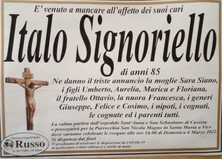 Santa Maria a Vico. Lutto a Santa Maria a Vico per la dipartita di un cittadino appartenente ad una famiglia molto conosciuta e stimata, E’ scomparso ad 85 anni, Italo Signoriello, personalità di spicco nel campo del ramo assicurativo, con la fondazione di alcune agenzie diffuse in provincia di Caserta.