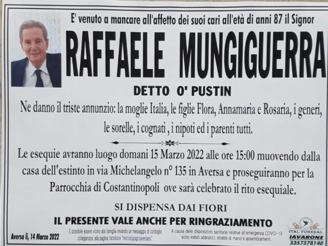 Mungiguerra si è spento ieri mattina all’età di 87 anni, attorniato dall’affetto dei suoi cari: le esequie muoveranno dall’abitazione di famiglia in via Michelangelo ad Aversa. Decine i messaggi di cordoglio che in queste ore stanno giungendo alla moglie Italia ed alle sue tre figlie.