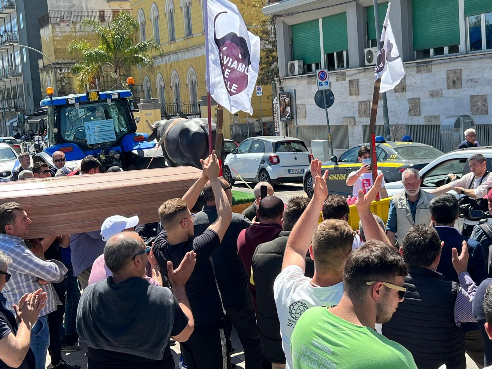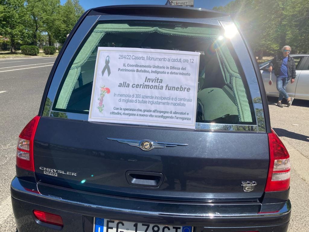 Lo hanno fatto con tanto di bara, manifesti e marcia funebre (suonata da una banda musicale proveniente da Bellona) per ricordare le 300 aziende di Terra di Lavoro costrette a chiudere per le 140mila bufale abbattute nell’ultimo decennio, il 99% delle quali – si è scoperto – non erano malate ma assolutamente sane; c’erano anche 140 bottiglie contenente liquido rosso a simboleggiare il sangue di ogni bufala abbattuta. Una situazione che riguarda quasi esclusivamente il Casertano – il Salernitano, altra zona di allevamento e produzione della mozzarella Dop ne è quasi immune – e in particolare quattro comuni focolaio, ovvero Grazzanise, Santa Maria la Fossa, Cancello e Arnone e Castel Volturno, dove si concentra la più grande percentuale di allevamenti e di produzione della mozzarella Dop. Tanti gli allevatori giovani presenti, di seconda o terza generazione, qualcuno laureato ma tutti orgogliosi del loro lavoro che valorizza il territorio. Gli allevatori già vennero in corteo a Caserta a gennaio, e poi hanno dato vita a numerose proteste.