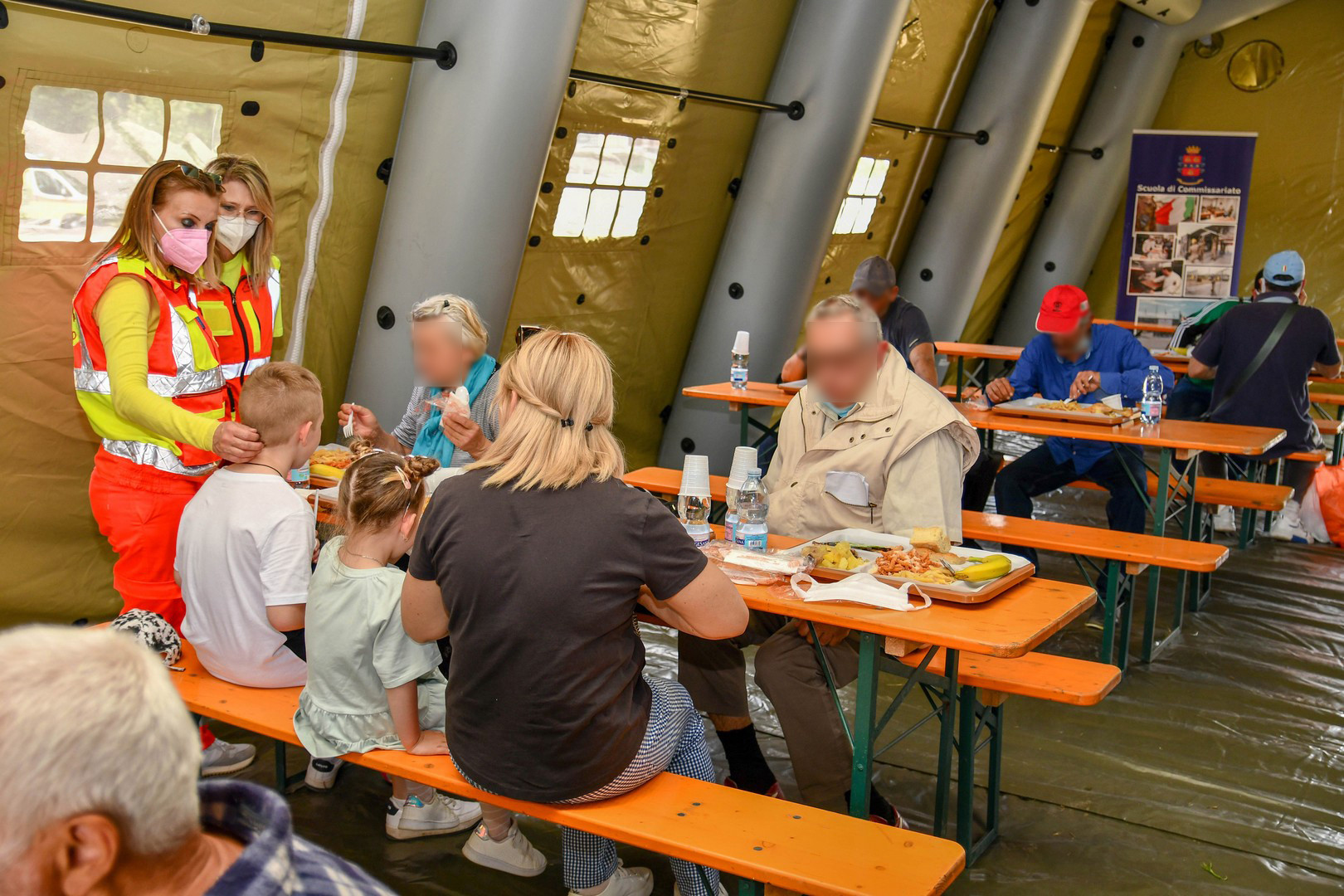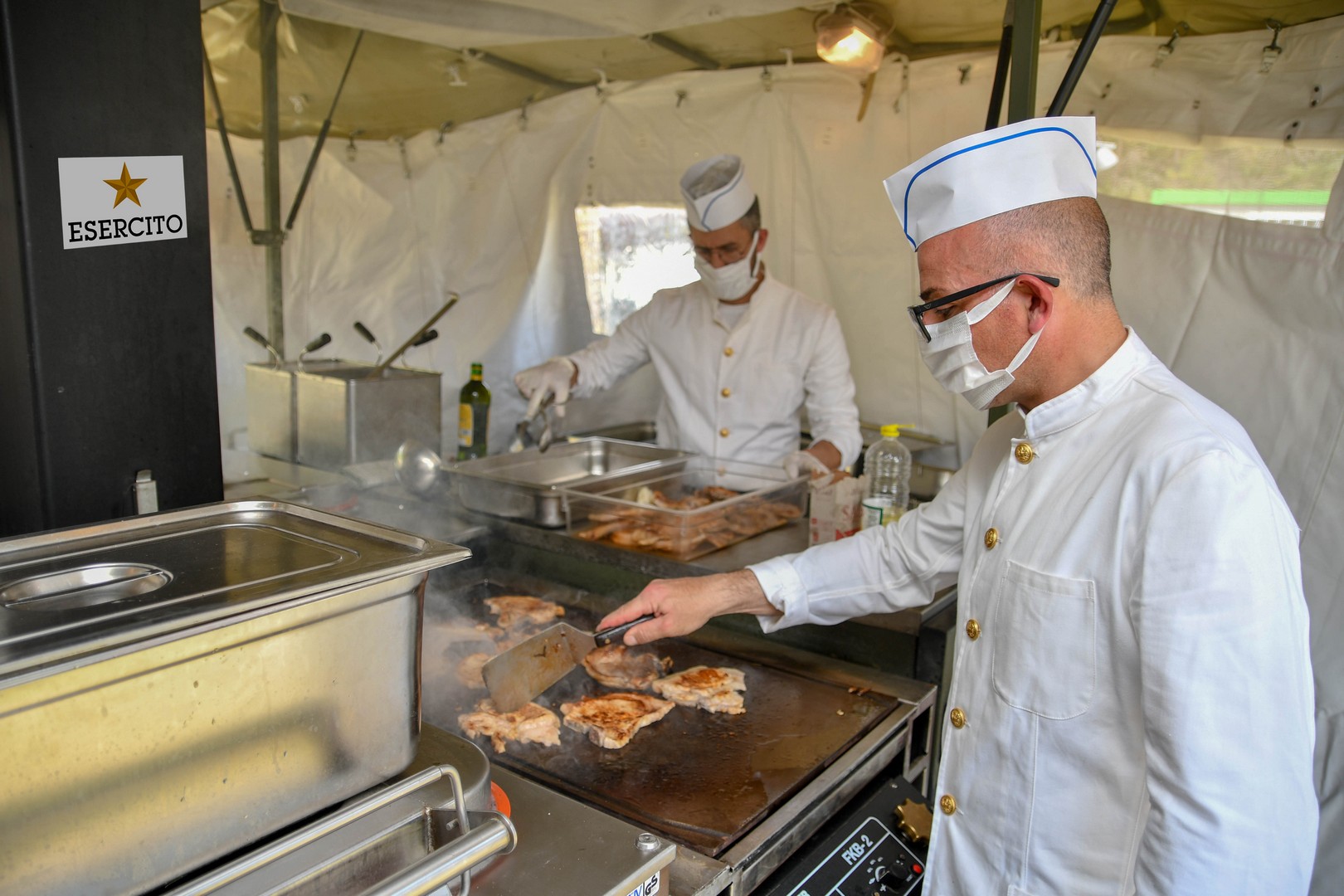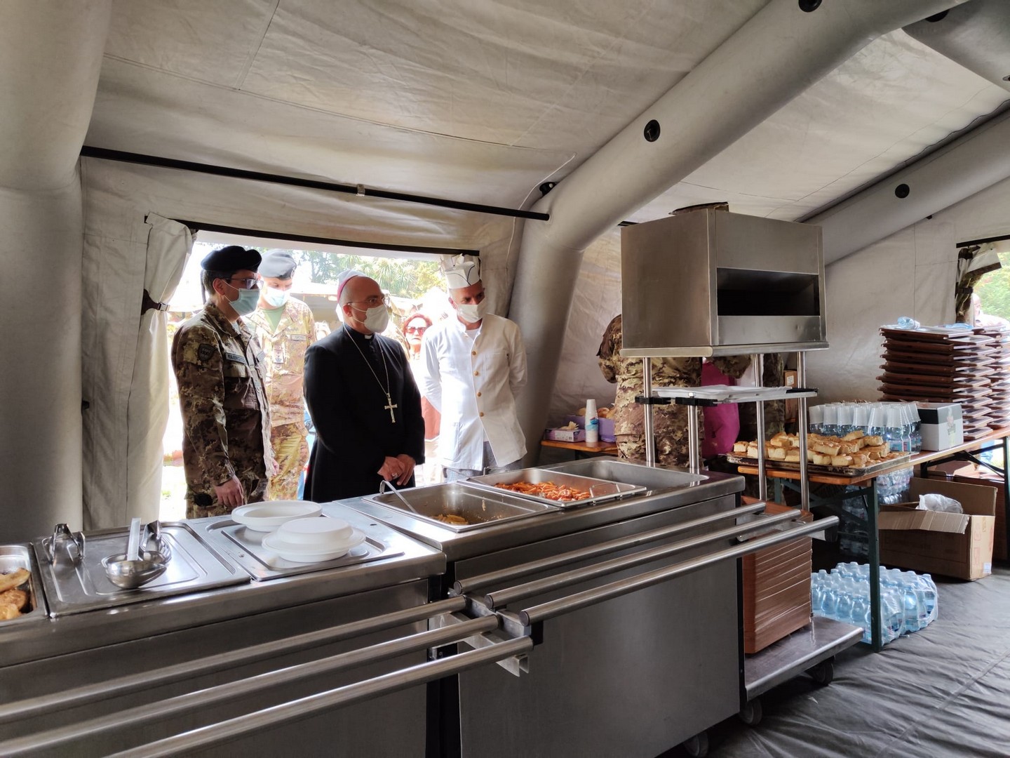 In particolare, la Scuola di Commissariato, Ente dipendente dal Comando Logistico dell’Esercito per il tramite del Comando di Commissariato, ha allestito 4 tende e precisamente: una attrezzata per la distribuzione dei pasti, due tende refettorio per la consumazione del vitto e una tenda servizio, dove sono stati allocati alcuni lavabo per il rispetto delle condizioni igieniche. E’ stata allestita anche una cucina da campo rotabile, mezzo campale impiegato dall’Esercito nelle operazioni di pace all’estero e nelle attività di pubbliche calamità, in grado di confezionare circa 200 razioni all’ora e utilizzato dai militari della Scuola di Commissariato per la preparazione del vitto.