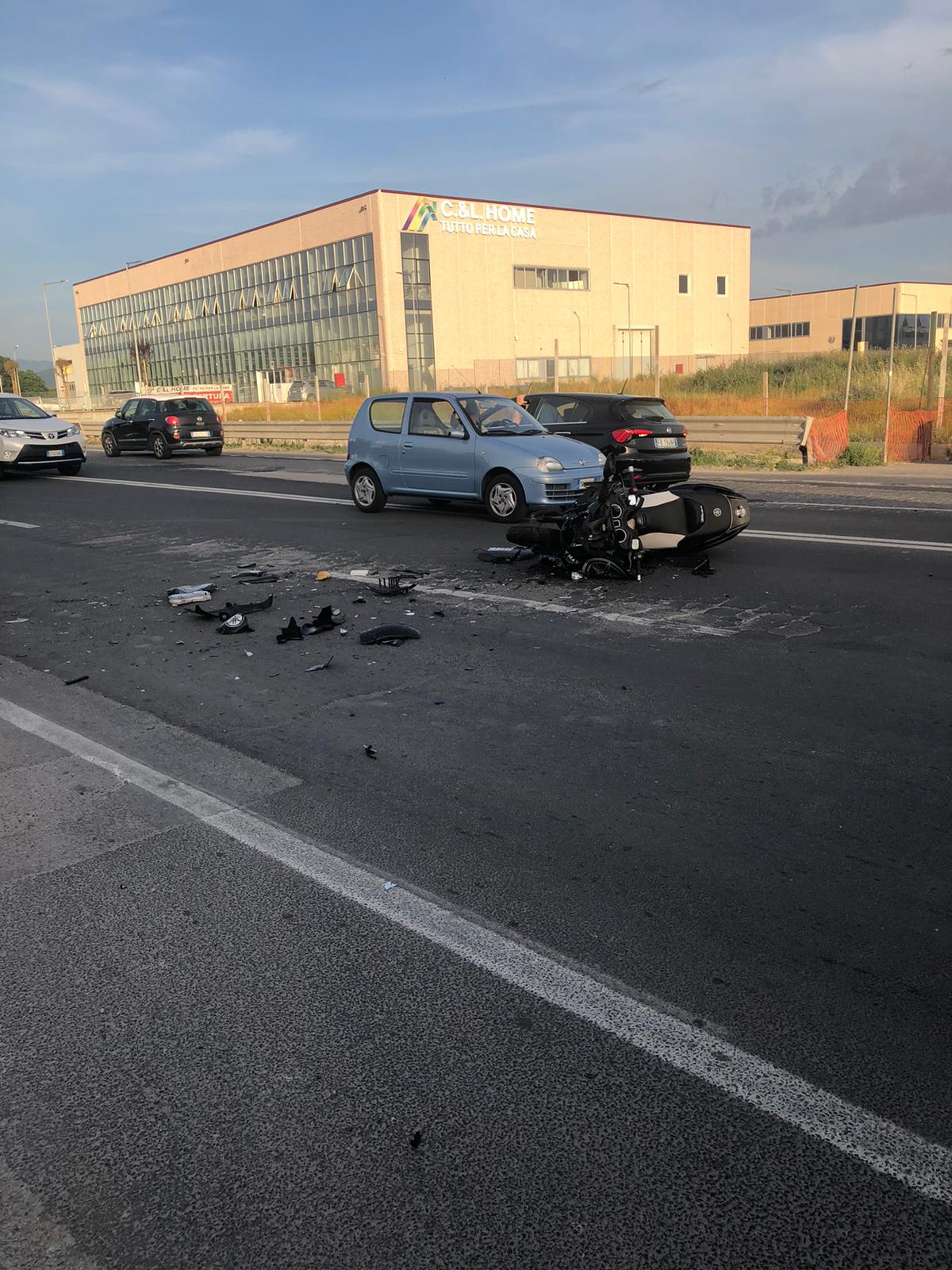 Un centauro è rimasto a terra sull’asfalto dopo uno spaventoso volo. Lo scooter Yamaha T-Max sul quale viaggiava è stato infatti centrato da un’Opel Corsa che procedeva in direzione opposta. Stando ad alcune testimonianze la vettura ha tagliato la strada alla moto.