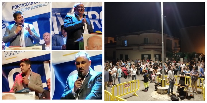 Un’ampia premessa quella del capolista che ha aperto al lungo elenco dei lavori attualmente in fase di esecuzioni messi in atto durante il suo percorso amministrativo: il rifacimento della rete elettrica, il collettore e la risoluzione all’annoso problema degli allagamenti, il rifacimento del centro storico e della casa comunale, la costruzione del nuovo plesso di Portico Centro, i lavori per la rete fognaria nell’area di Musicile, di Viale Partenope, l’ installazione degli ecocompattatori, il finanziamento ottenuto di 500mila euro per il rifacimento del manto stradale di tutte le strade di Portico, i fondi PNRR per il campo sportivo, per la pista ciclabile, la perimetrazione area Pip e la sua trasformazione in Zona Economica speciale, il progetto già presentato dell’isola ecologica.