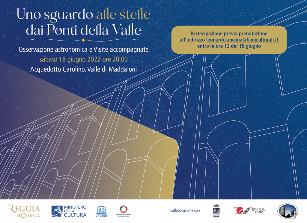 Caserta. Sabato 18 giugno torna “Uno sguardo alle Stelle dai Ponti della Valle”. La Reggia di Caserta, in collaborazione con il Comune di Valle di Maddaloni, la Pro Loco “Valle” e l’AstroUMAC, organizza una serata gratuita di osservazione astronomica dall’Acquedotto Carolino.