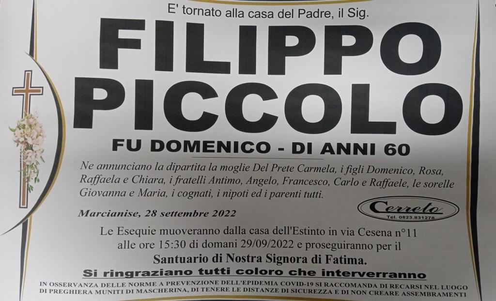 I funerali di Filippo Piccolo saranno celebrati domani alle 15,30 nella chiesa di Nostra Signora di Fatima a Marcianise. Lascia la moglie Carmela e quattro figli: Raffaela, Chiara, Domenico e Rosa, che soltanto poche ore prima ha perso l’adorato marito.