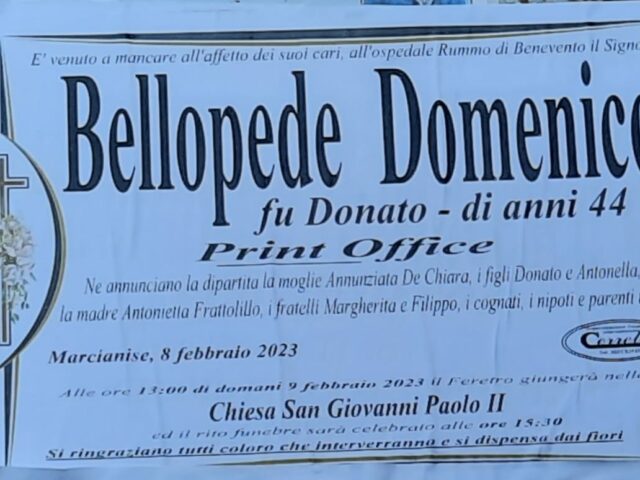 Nelle prossime ore la salma di Domenico lascerà l’ospedale sannita per l’ultimo viaggio: alle 13 di domani giungerà alla chiesa di San Giovanni Paolo II, nel rione San Giuliano, dove alle 15,30 sarà celebrato il rito funebre.