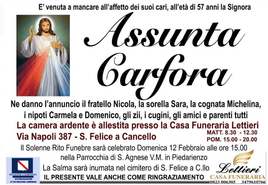 Assunta lascia il fratello Nicola, la sorella Sara, la cognata, i nipoti e gli altri parenti. A seguire la salma sarà inumata nel cimitero di San Felice. E’ stato davvero un dramma per la famiglia, Assunta ad inizio settimana era andata ad accompagnare la sorella al Cardarelli per delle visite e mentre era in quella struttura si è sentita male, un malore che nel giro di due giorni si è rivelato fatale, non si è più risvegliata.