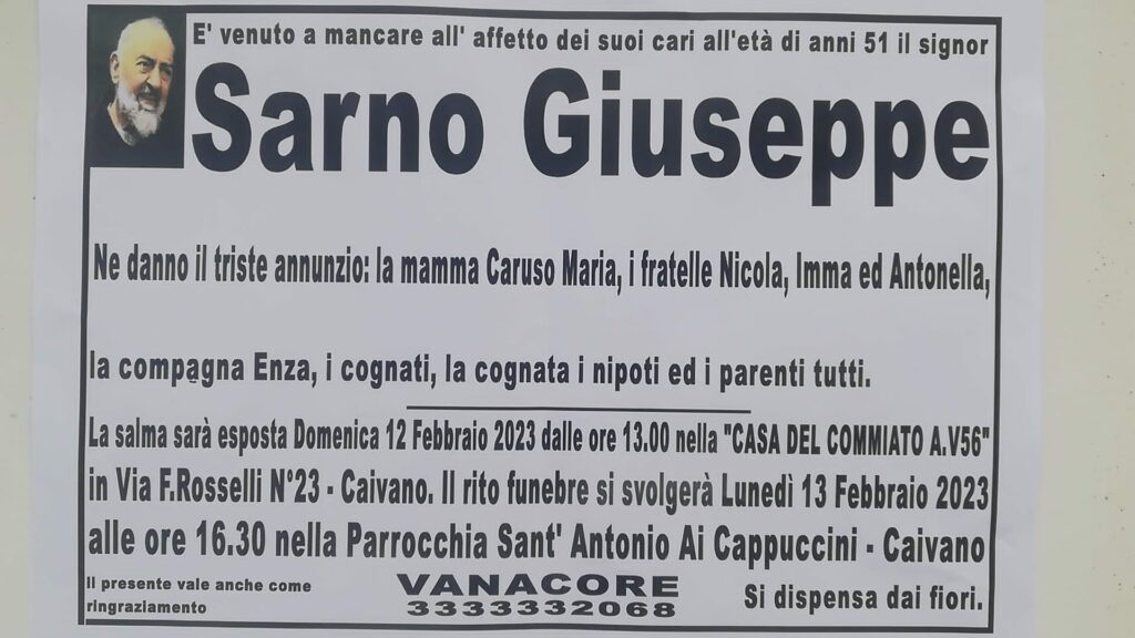 Caivano/Caserta. E’ spirato questa notte presso l’ospedale di Frattamaggiore a soli 51 anni, Giuseppe Sarno, di Caivano, dipendente della Edil Mec di Caserta, azienda che da 50 anni opera nel settore macchine e attrezzature per l’edilizia e la cantieristica stradale.
