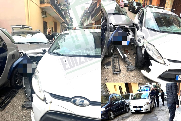 Marcianise. Carambola e successivo groviglio di auto in via Diaz a Marcianise, una delle arterie perpendicolari a via Musone. Una Smart vecchio tipo è stata completamente schiacciata in seguito a questo sinistro. Una Fiat Panda condotta da una signora, mentre impegnava la strada dal civico 15 andava in collisione in una Ford bianca in transito. Nell’impatto le due auto centravano la Smart che era parcheggiata subito dopo la Panda.