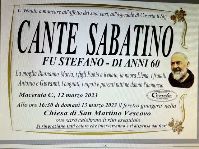 Macerata Campania. Si è spento oggi all’ospedale di Caserta a 60 anni Sabatino Cante, originario di Macerata Campania, via Vescovo Mingione. Stava combattendo contro un brutto male che in poche settimane lo ha strappato all’affetto dei suoi cari.