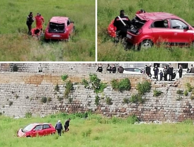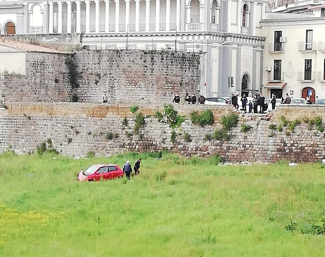 Capua. Incredibile incidente pochi minuti in via Umberto I a ridosso del teatro Ricciardi. Un auto ha sfondato il muro perimetrale che costeggia il centro finendo nei fossati.