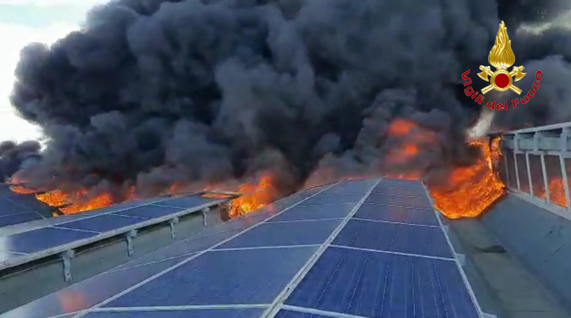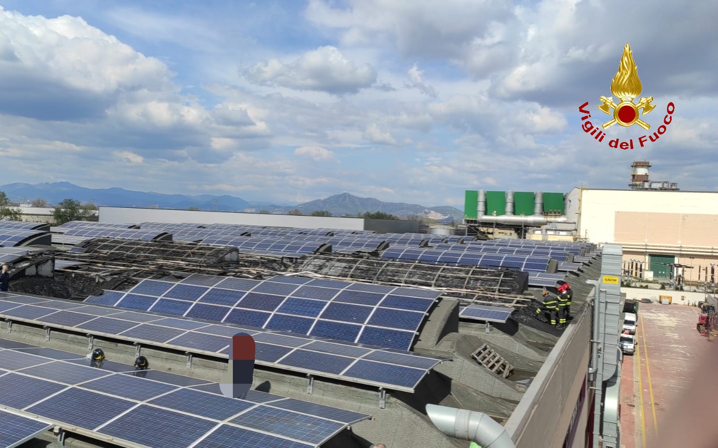 Secondo le prime ricostruzioni il rogo sarebbe scoppiato sul tetto di un opificio dove erano stati installati dei pannelli fotovoltaici. Da escludere, dunque, il rischio di un incendio all’interno della fabbrica.