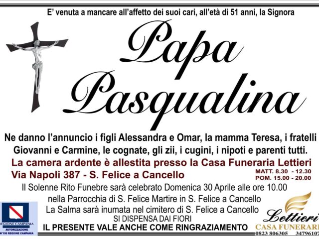 San Felice a Cancello. Un grave lutto scuote la comunità di San Felice a Cancello e tocca anche la campagna elettorale. È venuta a mancare all’età di 51 anni Pasqualina Papa, per tutti Lina, donna molto stimata e benvoluta tra Cave, San Felice centro e non solo.