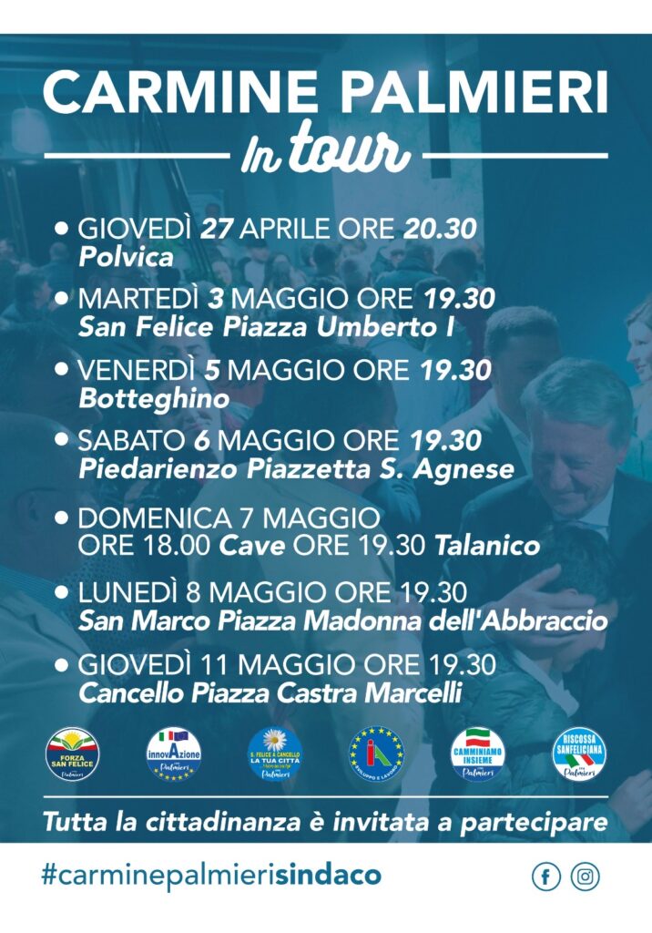 “Carmine Palmieri in Tour” entra nel vivo. Dopo il grande successo di ieri in Piazza Umberto I a San Felice a Cancello, il candidato sindaco insieme ai candidati alla carica di consigliere della propria coalizione continuerà ad incontrare i cittadini di ogni zona di San Felice a Cancello.