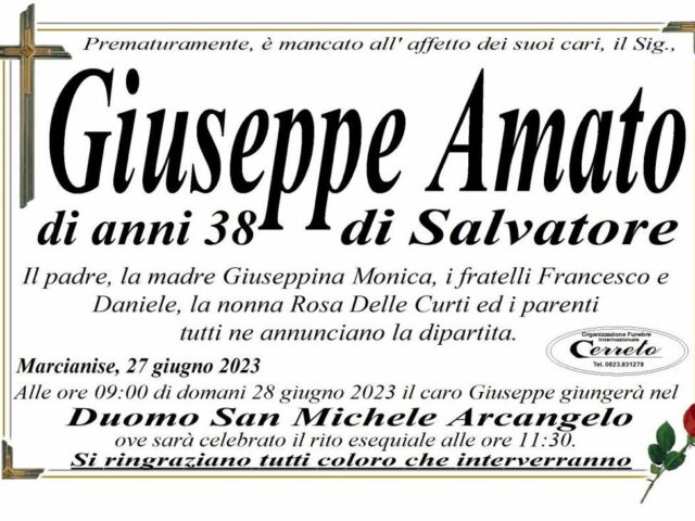 Saranno celebrati domani alle 11.30 nella chiesa di San Michele Arcangelo a Marcianise i funerali di Giuseppe Amato, il 38enne venuto a mancare nella notte tra venerdì e sabato mentre si trovava nella casa al mare a Maratea.